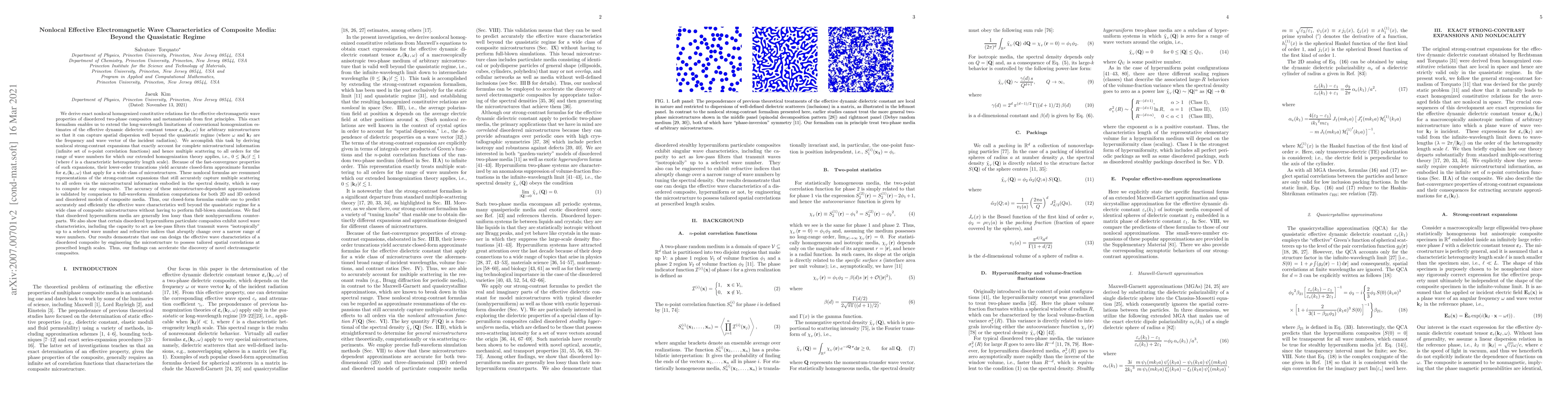 We derive exact nonlocal expressions for the effective dielectric constant tensor ${\boldsymbol \varepsilon}_e({\bf k}_I, \omega)$ of disordered two-phase composites and metamaterials from first principles. This formalism extends the long-wavelength limitations of conventional homogenization estimates of ${\boldsymbol \varepsilon}_e({\bf k}_I, \omega)$ for arbitrary microstructures so that it can capture spatial dispersion well beyond the quasistatic regime (where $\omega$ and ${\bf k}_I$ are frequency and wavevector of the incident radiation). This is done by deriving nonlocal strong-contrast expansions that exactly account for multiple scattering for the range of wavenumbers for which our extended homogenization theory applies, i.e., $0 \le |{\bf k}_I| \ell \lesssim 1$ (where $\ell$ is a characteristic heterogeneity length scale). Due to the fast-convergence properties of such expansions, their lower-order truncations yield accurate closed-form approximate formulas for ${\varepsilon}_e({\bf k}_I,\omega)$ that incorporate microstructural information via the spectral density, which is easy to compute for any composite. The accuracy of these microstructure-dependent approximations is validated by comparison to full-waveform simulation methods for both 2D and 3D ordered and disordered models of composite media. Thus, our closed-form formulas enable one to predict accurately and efficiently the effective wave characteristics well beyond the quasistatic regime without having to perform full-blown simulations. Among other results, we show that certain disordered hyperuniform particulate composites exhibit novel wave characteristics. Our results demonstrate that one can design the effective wave characteristics of a disordered composite by engineering the microstructure to possess tailored spatial correlations at prescribed length scales.