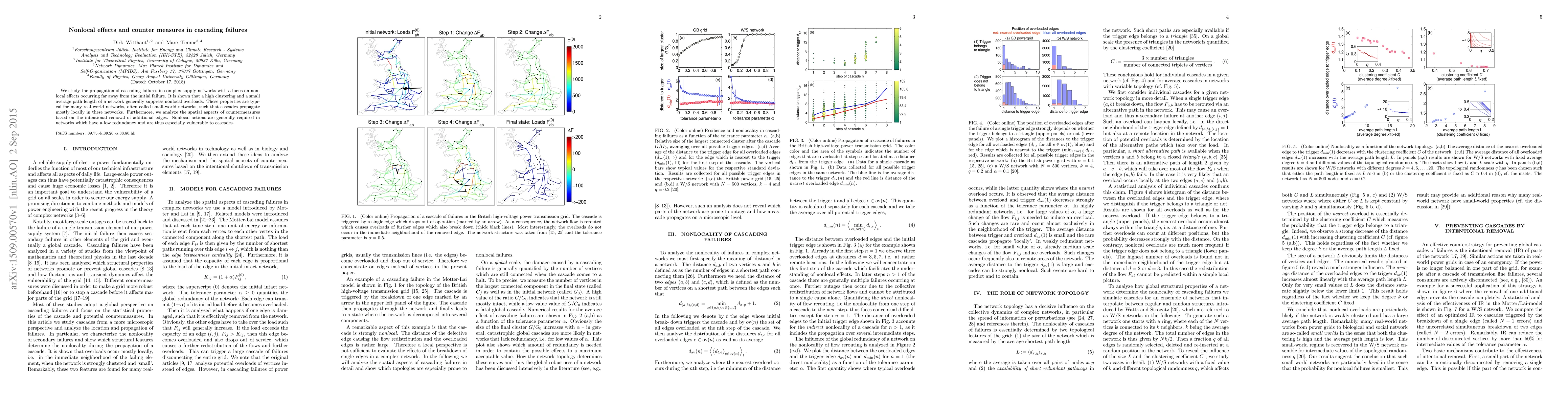 This paper investigates cascading failures in complex supply networks, highlighting that nonlocal effects are minimized in networks with high clustering and short average path lengths, typical of small-world networks. It also examines countermeasures, showing that nonlocal actions are crucial for networks with low redundancy to prevent widespread cascades.