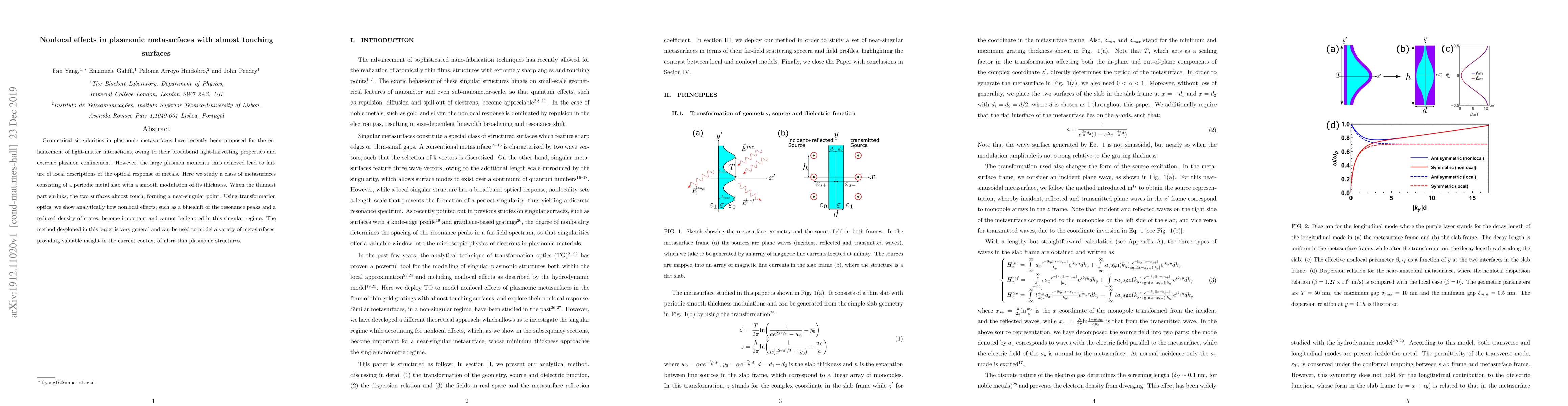 Geometrical singularities in plasmonic metasurfaces have recently been proposed for the enhancement of light-matter interactions, owing to their broadband light-harvesting properties and extreme plasmon confinement. However, the large plasmon momenta thus achieved lead to failure of local descriptions of the optical response of metals. Here we study a class of metasurfaces consisting of a periodic metal slab with a smooth modulation of its thickness. When the thinnest part shrinks, the two surfaces almost touch, forming a near-singular point. Using transformation optics, we show analytically how nonlocal effects, such as a blueshift of the resonance peaks and a reduced density of states, become important and cannot be ignored in this singular regime. The method developed in this paper is very general and can be used to model a variety of metasurfaces, providing valuable insight in the current context of ultra-thin plasmonic structures.