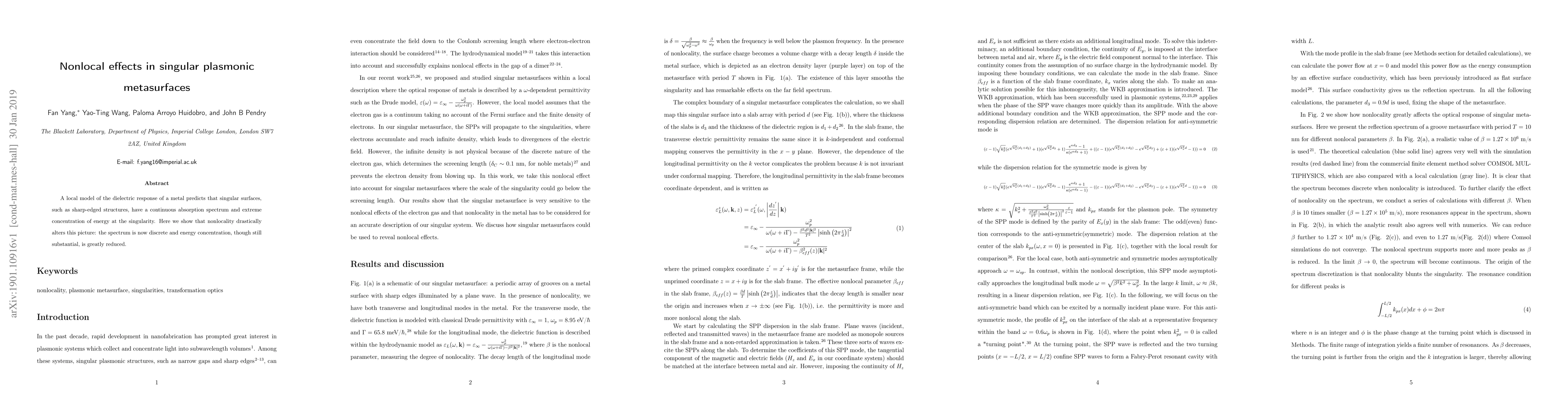 A local model of the dielectric response of a metal predicts that singular surfaces, such as sharp-edged structures, have a continuous absorption spectrum and extreme concentration of energy at the singularity. Here we show that nonlocality drastically alters this picture: the spectrum is now discrete and energy concentration, though still substantial, is greatly reduced.