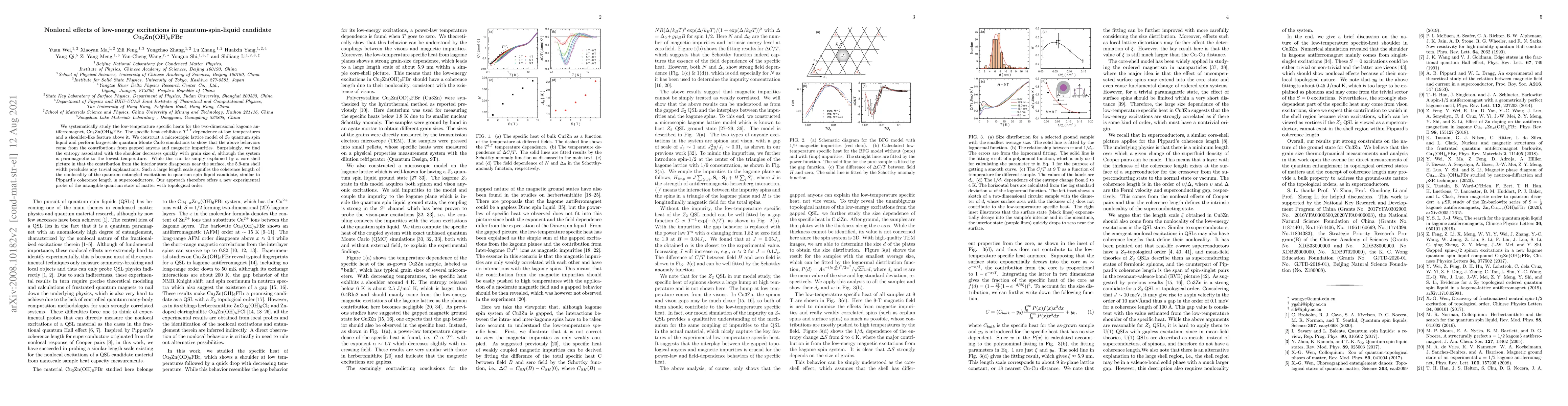 We systematically study the low-temperature specific heats for the two-dimensional kagome antiferromagnet, Cu$_{3}$Zn(OH)$_6$FBr. The specific heat exhibits a $T^{1.7}$ dependence at low temperatures and a shoulder-like feature above it. We construct a microscopic lattice model of $Z_2$ quantum spin liquid and perform large-scale quantum Monte Carlo simulations to show that the above behaviors come from the contributions from gapped anyons and magnetic impurities. Surprisingly, we find the entropy associated with the shoulder decreases quickly with grain size $d$, although the system is paramagnetic to the lowest temperature. While this can be simply explained by a core-shell picture in that the contribution from the interior state disappears near the surface, the 5.9-nm shell width precludes any trivial explanations. Such a large length scale signifies the coherence length of the nonlocality of the quantum entangled excitations in quantum spin liquid candidate, similar to Pippard's coherence length in superconductors. Our approach therefore offers a new experimental probe of the intangible quantum state of matter with topological order.