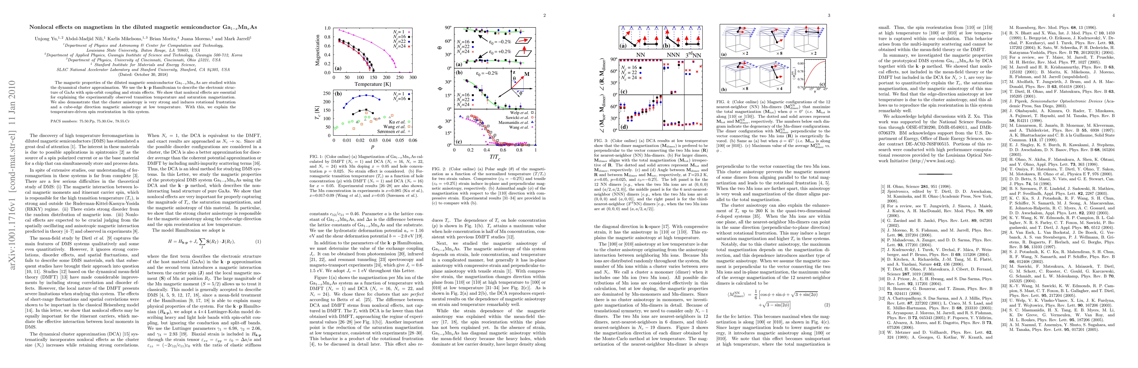 This paper investigates the magnetic properties of Ga_{1-x}Mn_{x}As using the dynamical cluster approximation and k-dot-p Hamiltonian, revealing that nonlocal effects are crucial for explaining the observed transition temperature and saturation magnetization. It also demonstrates strong cluster anisotropy leading to rotational frustration and a cube-edge direction magnetic anisotropy, explaining the temperature-driven spin reorientation.