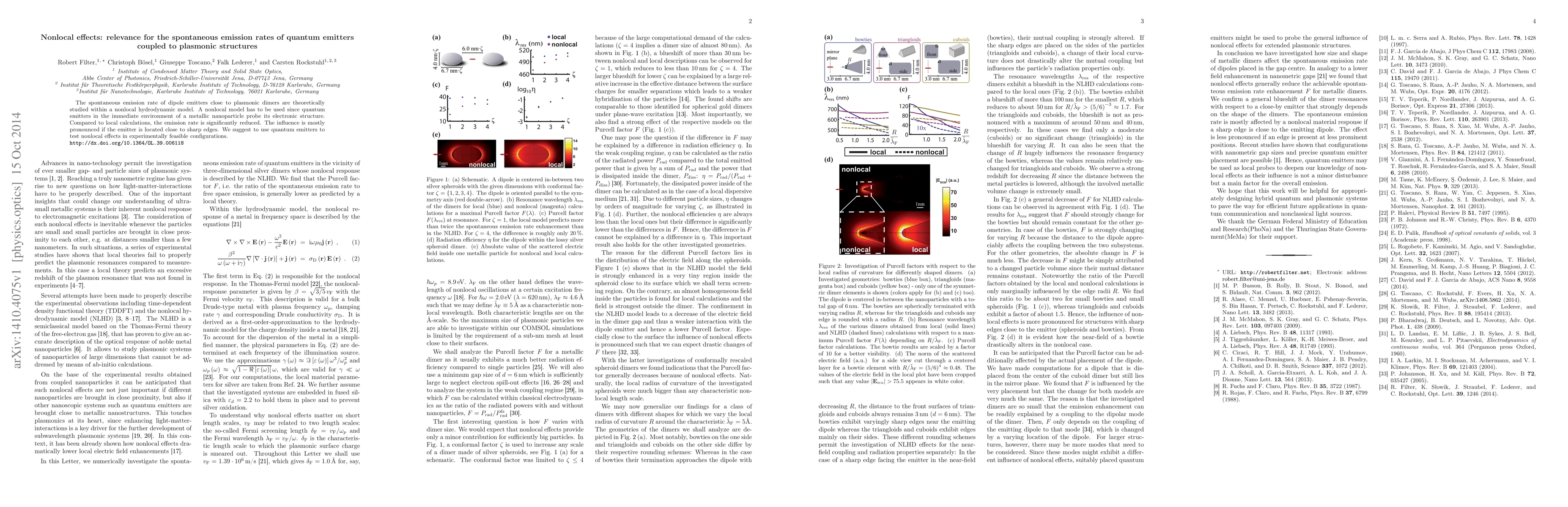 The spontaneous emission rate of dipole emitters close to plasmonic dimers are theoretically studied within a nonlocal hydrodynamic model. A nonlocal model has to be used since quantum emitters in the immediate environment of a metallic nanoparticle probe its electronic structure. Compared to local calculations, the emission rate is significantly reduced. The influence is mostly pronounced if the emitter is located close to sharp edges. We suggest to use quantum emitters to test nonlocal effects in experimentally feasible configurations.