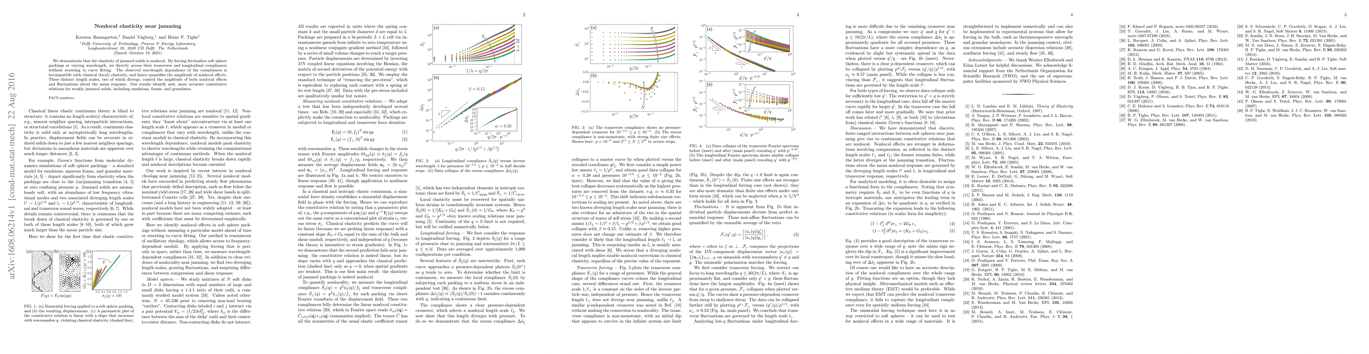 We demonstrate that the elasticity of jammed solids is nonlocal. By forcing frictionless soft sphere packings at varying wavelength, we directly access their transverse and longitudinal compliances without resorting to curve fitting. The observed wavelength dependence of the compliances is incompatible with classical (local) elasticity, and hence quantifies the amplitude of nonlocal effects. Three distinct length scales, two of which diverge, control the amplitude of both nonlocal effects and fluctuations about the mean response. Our results identify new, more accurate constitutive relations for weakly jammed solids, including emulsions, foams, and granulates.