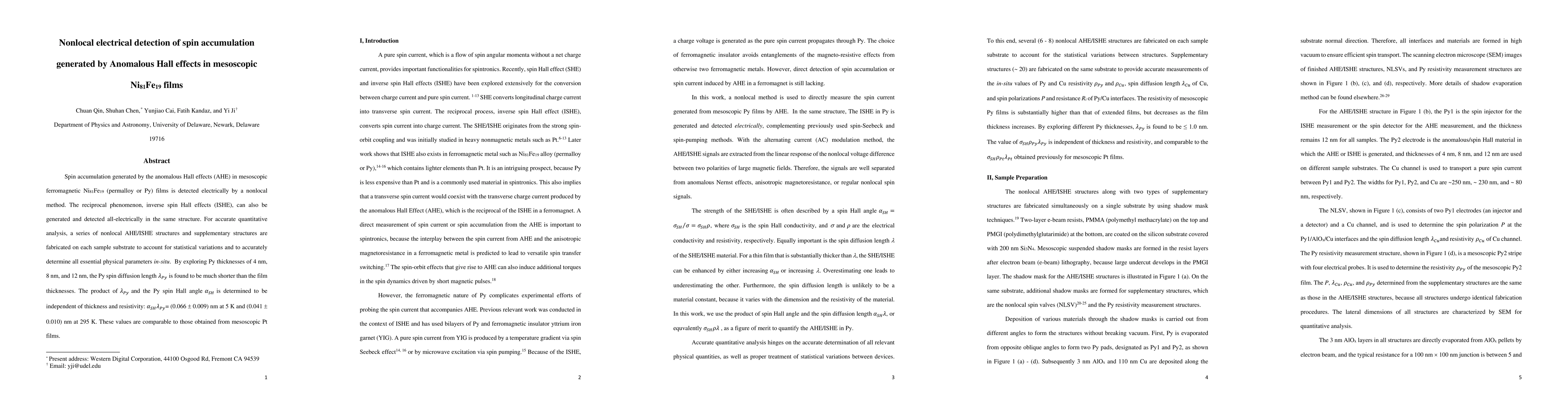Spin accumulation generated by the anomalous Hall effects (AHE) in mesoscopic ferromagnetic Ni81Fe19 (permalloy or Py) films is detected electrically by a nonlocal method. The reciprocal phenomenon, inverse spin Hall effects (ISHE), can also be generated and detected all-electrically in the same structure. For accurate quantitative analysis, a series of nonlocal AHE/ISHE structures and supplementary structures are fabricated on each sample substrate to account for statistical variations and to accurately determine all essential physical parameters in-situ. By exploring Py thicknesses of 4 nm, 8 nm, and 12 nm, the Py spin diffusion length {\lambda}_Py is found to be much shorter than the film thicknesses. The product of {\lambda}_Py and the Py spin Hall angle {\alpha}_SH is determined to be independent of thickness and resistivity: {\alpha}_SH*{\lambda}_Py= (0.066 +/- 0.009) nm at 5 K and (0.041 +/- 0.010) nm at 295 K. These values are comparable to those obtained from mesoscopic Pt films.