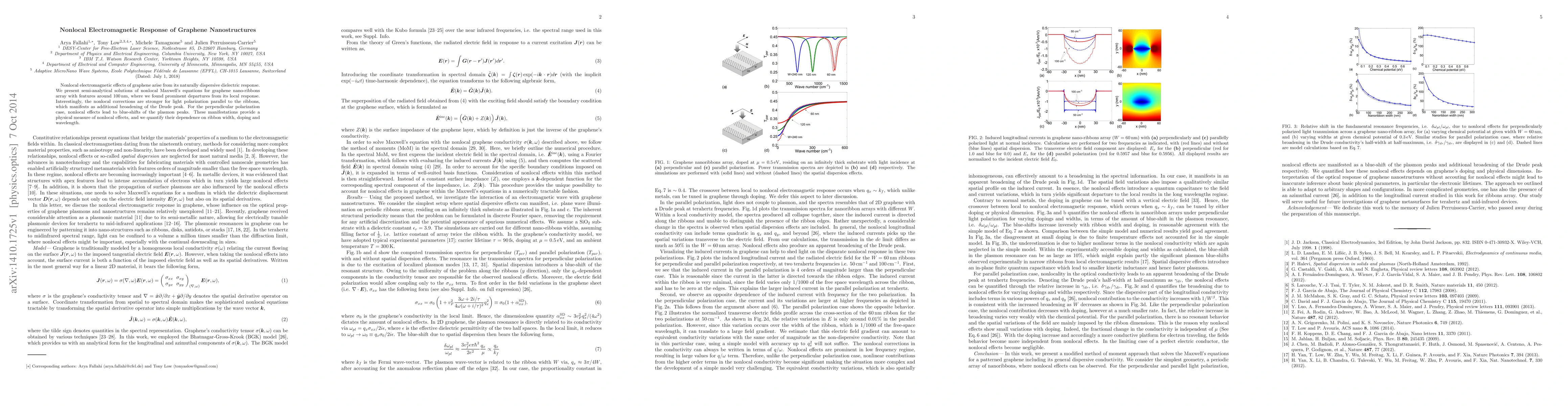 Nonlocal electromagnetic effects of graphene arise from its naturally dispersive dielectric response. We present semi-analytical solutions of nonlocal Maxwell's equations for graphene nano-ribbons array with features around 100 nm, where we found prominent departures from its local response. Interestingly, the nonlocal corrections are stronger for light polarization parallel to the ribbons, which manifests as additional broadening of the Drude peak. For the perpendicular polarization case, nonlocal effects lead to blue-shifts of the plasmon peaks. These manifestations provide a physical measure of nonlocal effects, and we quantify their dependence on ribbon width, doping and wavelength.