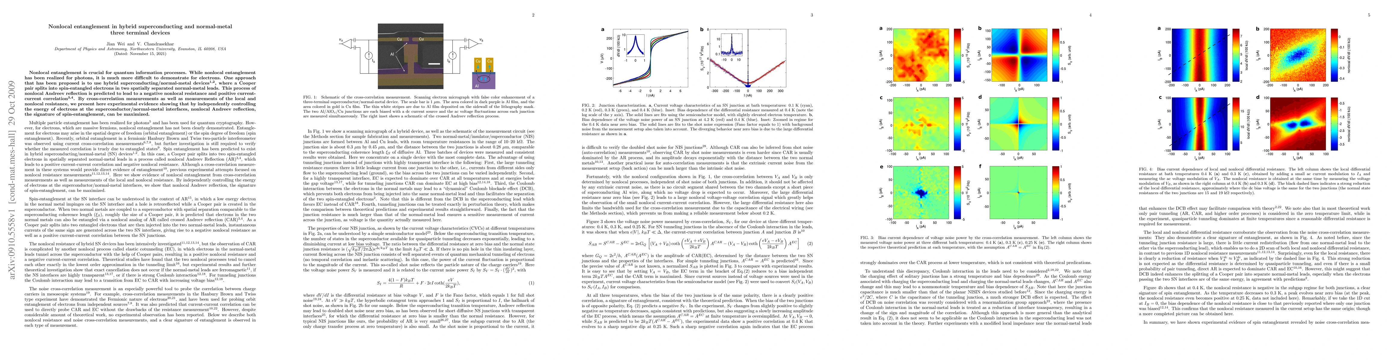 This paper demonstrates experimental evidence for nonlocal entanglement in hybrid superconducting/normal-metal devices through nonlocal Andreev reflection, showing maximized spin-entanglement by controlling electron energy at superconductor/normal-metal interfaces. The study reveals negative nonlocal resistance and positive current-current correlation, confirming the theoretical predictions of this phenomenon.