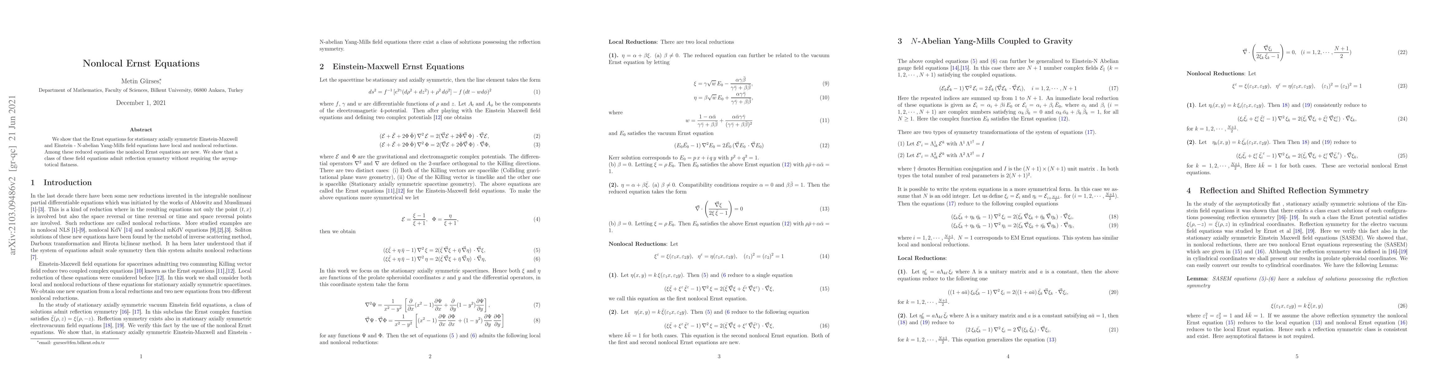 We show that the Ernst equations for stationary axially symmetric Einstein-Maxwell and Einstein - N-abelian Yang-Mills field equations have local and nonlocal reductions. Among these reduced equations the nonlocal Ernst equations are new. We show that a class of these field equations admit reflection symmetry without requiring the asymptotical flatness.
