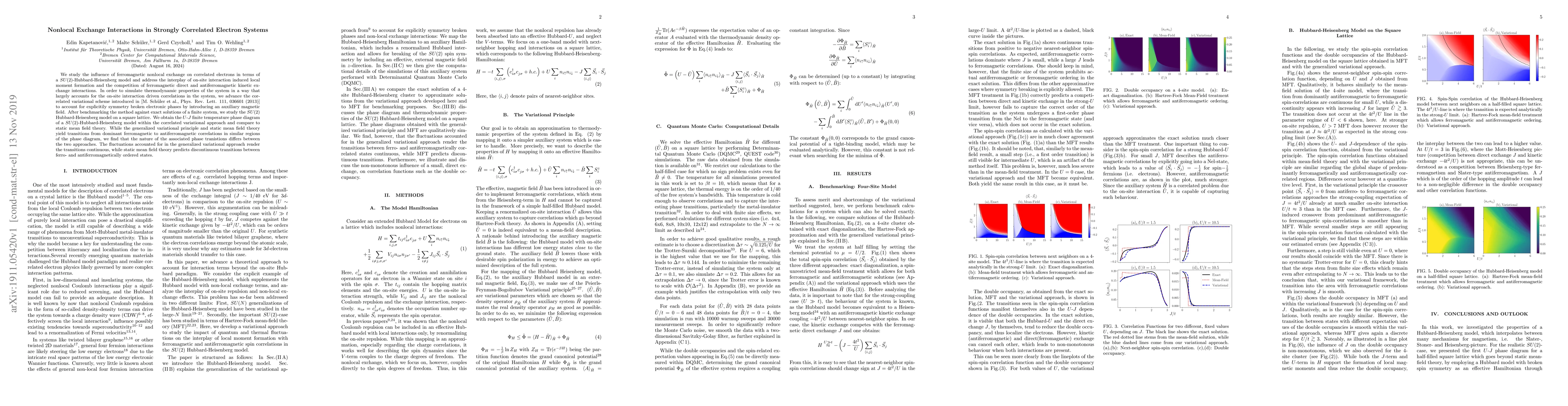 This paper investigates the effects of nonlocal ferromagnetic exchange in strongly correlated electron systems using an $SU(2)$-Hubbard-Heisenberg model, focusing on the interplay between local moment formation and competing exchange interactions. The study employs a refined correlated variational scheme to simulate thermodynamic properties and derives the $U$-$J$ finite temperature phase diagram, revealing continuous phase transitions in contrast to the discontinuous transitions predicted by static mean field theory.