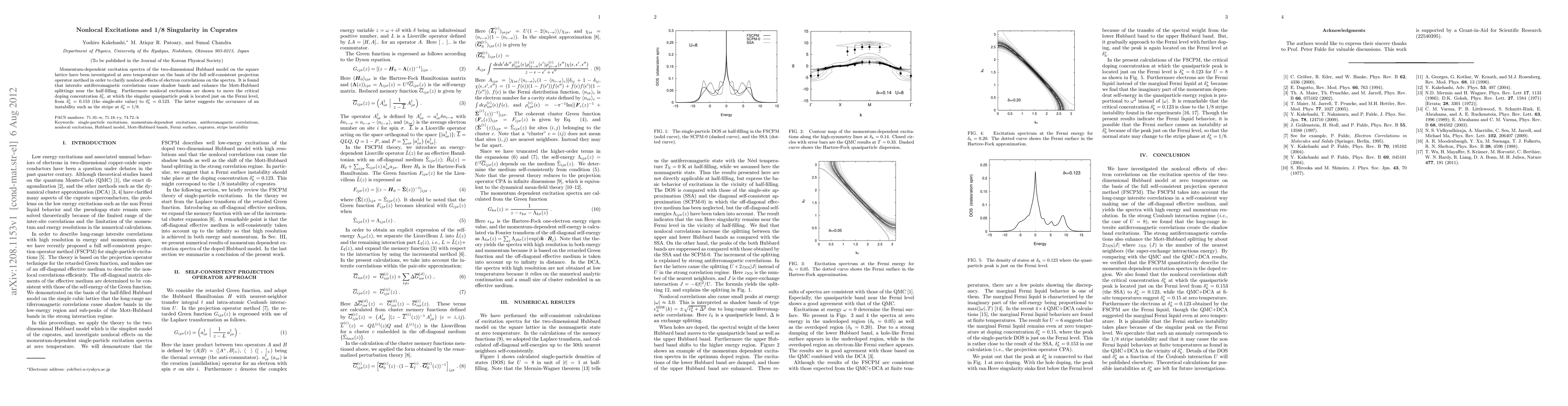 Momentum-dependent excitation spectra of the two-dimensional Hubbard model on the square lattice have been investigated at zero temperature on the basis of the full self-consistent projection operator method in order to clarify nonlocal effects of electron correlations on the spectra. It is found that intersite antiferromagnetic correlations cause shadow bands and enhance the Mott-Hubbard splittings near the half-filling. Furthermore nonlocal excitations are shown to move the critical doping concentration $\delta^{\ast}_{h}$, at which the singular quasiparticle peak is located just on the Fermi level, from $\delta^{\ast}_{h}=0.153$ (the single-site value) to $\delta^{\ast}_{h}=0.123$. The latter suggests the occurance of an instability such as the stripe at $\delta^{\ast}_{h}=1/8$.