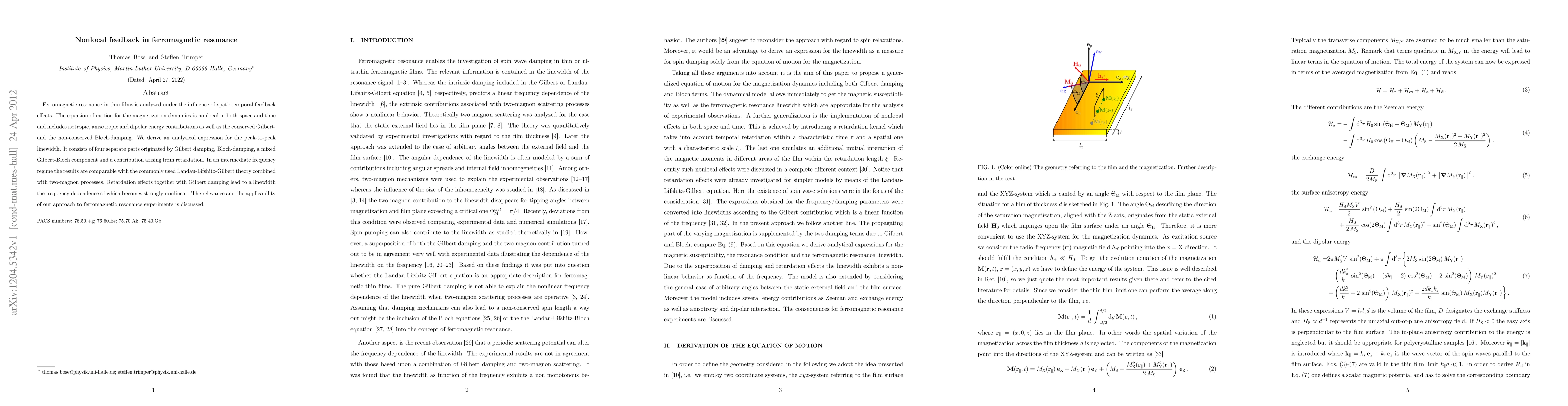 Researchers analyzed ferromagnetic resonance in thin films with nonlocal feedback effects, finding a peak-to-peak linewidth influenced by Gilbert damping, Bloch-damping, and retardation, with nonlinear frequency dependence in an intermediate range.