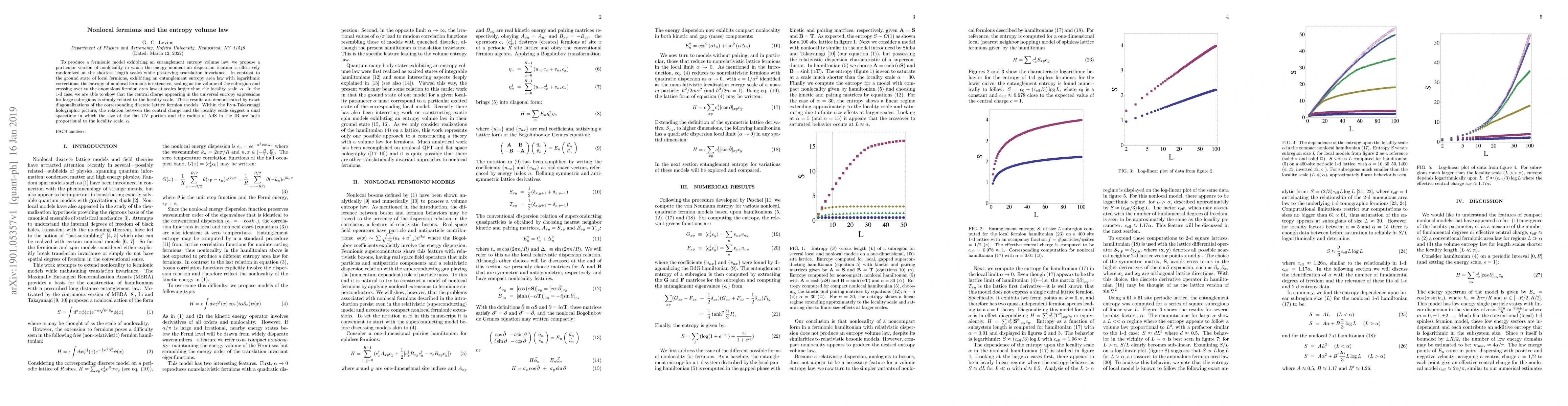 This research proposes a nonlocal fermion model exhibiting an entanglement entropy volume law, contrasting local fermions' area law. Exact diagonalizations of discrete lattice models demonstrate this, with implications for holographic duality and spacetime structure.}