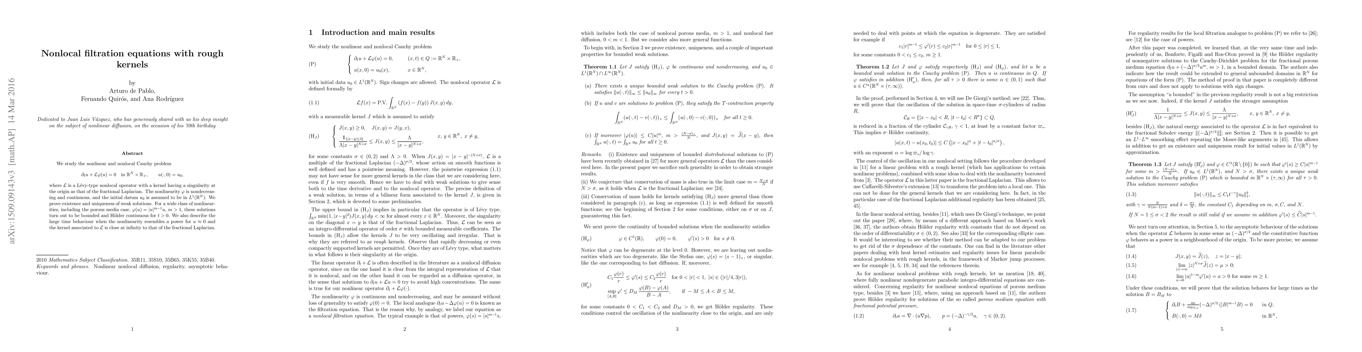 We study the nonlinear and nonlocal Cauchy problem \[ \partial_{t}u+\mathcal{L}\varphi(u)=0 \quad\text{in }\mathbb{R}^{N}\times\mathbb{R}_+,\qquad u(\cdot,0)=u_0, \] where $\mathcal{L}$ is a L\'evy-type nonlocal operator with a kernel having a singularity at the origin as that of the fractional Laplacian. The nonlinearity $\varphi$ is nondecreasing and continuous, and the initial datum $u_0$ is assumed to be in $L^1(\mathbb{R}^N)$. We prove existence and uniqueness of weak solutions. For a wide class of nonlinearities, including the porous media case, $\varphi(u)=|u|^{m-1}u$, $m>1$, these solutions turn out to be bounded and H\"older continuous for $t>0$. We also describe the large time behaviour when the nonlinearity resembles a power for $u\approx 0$ and the kernel associated to $\mathcal{L}$ is close at infinity to that of the fractional Laplacian.