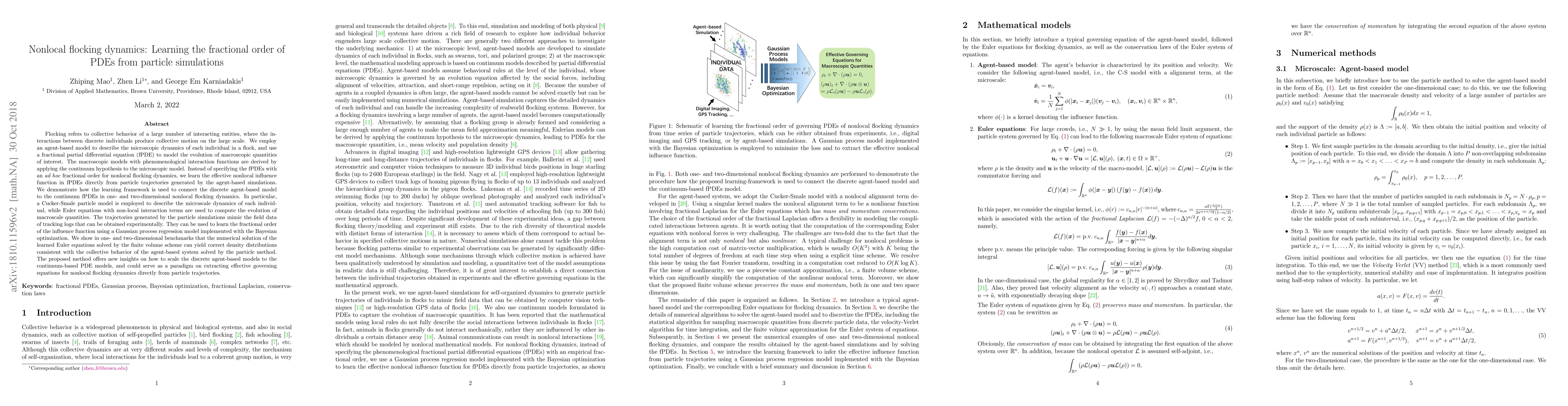 This research introduces a method to learn the fractional order of PDEs describing nonlocal flocking dynamics directly from particle simulation trajectories, using a Gaussian process regression model. It demonstrates the approach in 1D and 2D flocking models, connecting discrete agent-based systems to continuum-based PDEs, offering insights into scaling models and extracting governing equations from particle data.