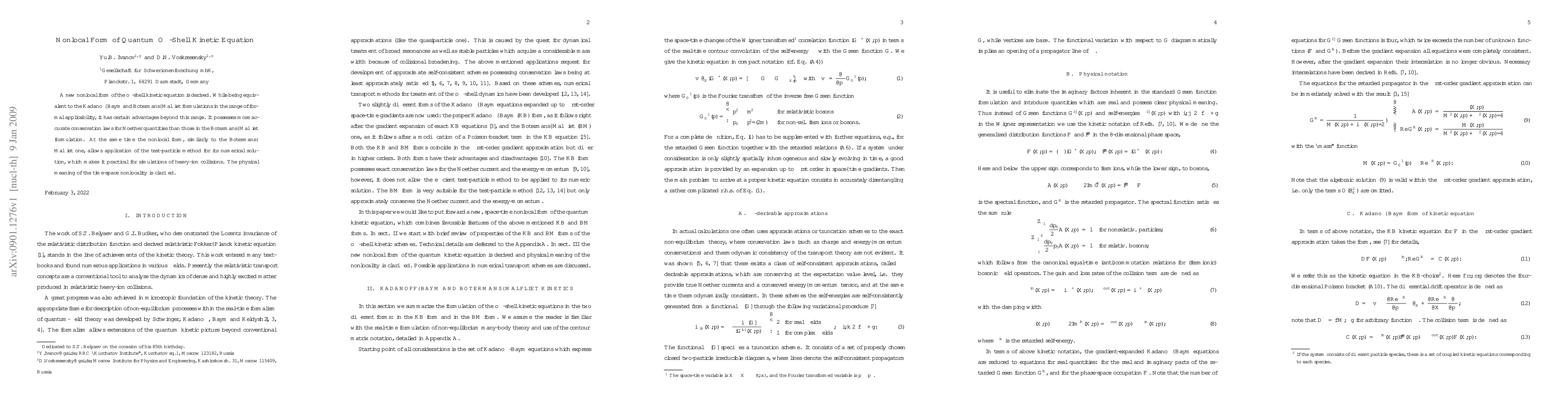 A new nonlocal form of the off-shell kinetic equation is derived with improved conservation laws and practical applications in heavy-ion collisions, offering advantages over existing formulations.
