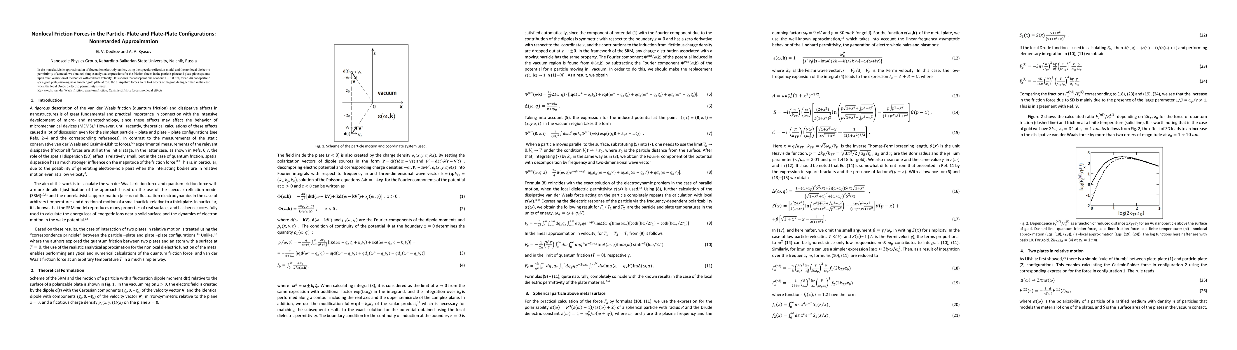 This paper derives analytical expressions for nonlocal friction forces in particle-plate and plate-plate systems using nonrelativistic fluctuation electrodynamics. It finds that nonlocal effects significantly increase friction forces by 2 to 4 orders of magnitude compared to local models, especially at separations of 1-10 nm for gold nanoparticles or plates.