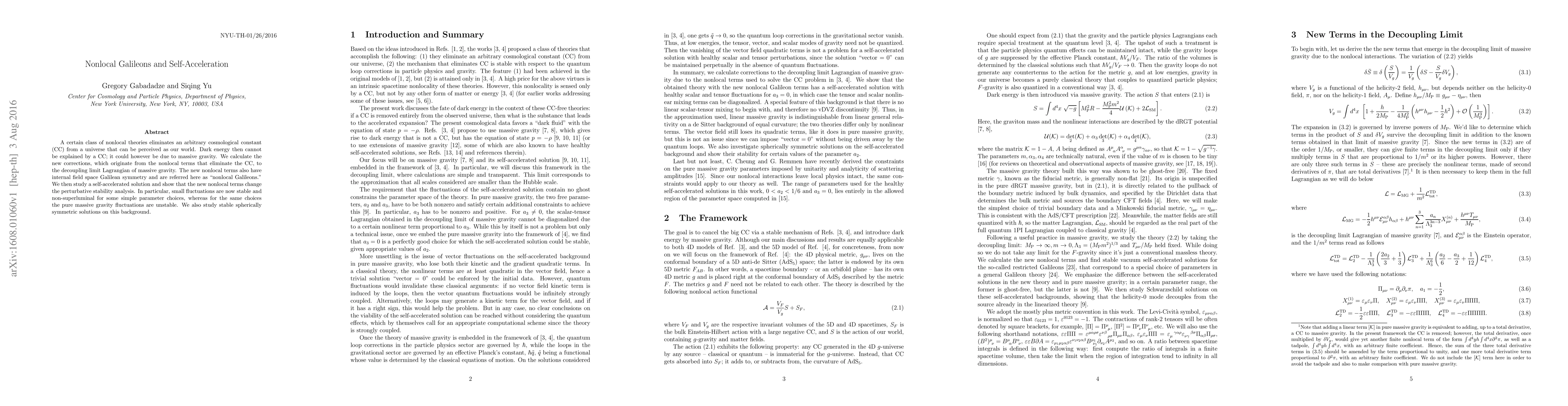 A certain class of nonlocal theories eliminates an arbitrary cosmological constant (CC) from a universe that can be perceived as our world. Dark energy then cannot be explained by a CC; it could however be due to massive gravity. We calculate the new corrections, which originate from the nonlocal terms that eliminate the CC, to the decoupling limit Lagrangian of massive gravity. The new nonlocal terms also have internal field space Galilean symmetry and are referred here as "nonlocal Galileons." We then study a self-accelerated solution and show that the new nonlocal terms change the perturbative stability analysis. In particular, small fluctuations are now stable and non-superluminal for some simple parameter choices, whereas for the same choices the pure massive gravity fluctuations are unstable. We also study stable spherically symmetric solutions on this background.