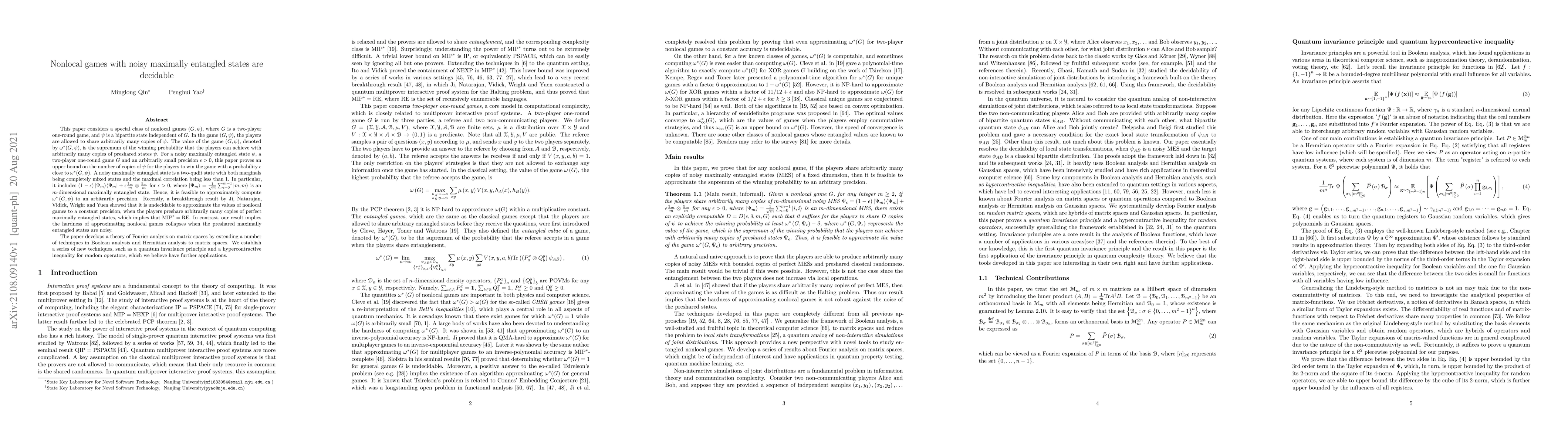 This paper considers a special class of nonlocal games $(G,\psi)$, where $G$ is a two-player one-round game, and $\psi$ is a bipartite state independent of $G$. In the game $(G,\psi)$, the players are allowed to share arbitrarily many copies of $\psi$. The value of the game $(G,\psi)$, denoted by $\omega^*(G,\psi)$, is the supremum of the winning probability that the players can achieve with arbitrarily many copies of preshared states $\psi$. For a noisy maximally entangled state $\psi$, a two-player one-round game $G$ and an arbitrarily small precision $\epsilon>0$, this paper proves an upper bound on the number of copies of $\psi$ for the players to win the game with a probability $\epsilon$ close to $\omega^*(G,\psi)$. Hence, it is feasible to approximately compute $\omega^*(G,\psi)$ to an arbitrarily precision. Recently, a breakthrough result by Ji, Natarajan, Vidick, Wright and Yuen showed that it is undecidable to approximate the values of nonlocal games to a constant precision when the players preshare arbitrarily many copies of perfect maximally entangled states, which implies that $\mathrm{MIP}^*=\mathrm{RE}$. In contrast, our result implies the hardness of approximating nonlocal games collapses when the preshared maximally entangled states are noisy. The paper develops a theory of Fourier analysis on matrix spaces by extending a number of techniques in Boolean analysis and Hermitian analysis to matrix spaces. We establish a series of new techniques, such as a quantum invariance principle and a hypercontractive inequality for random operators, which we believe have further applications.