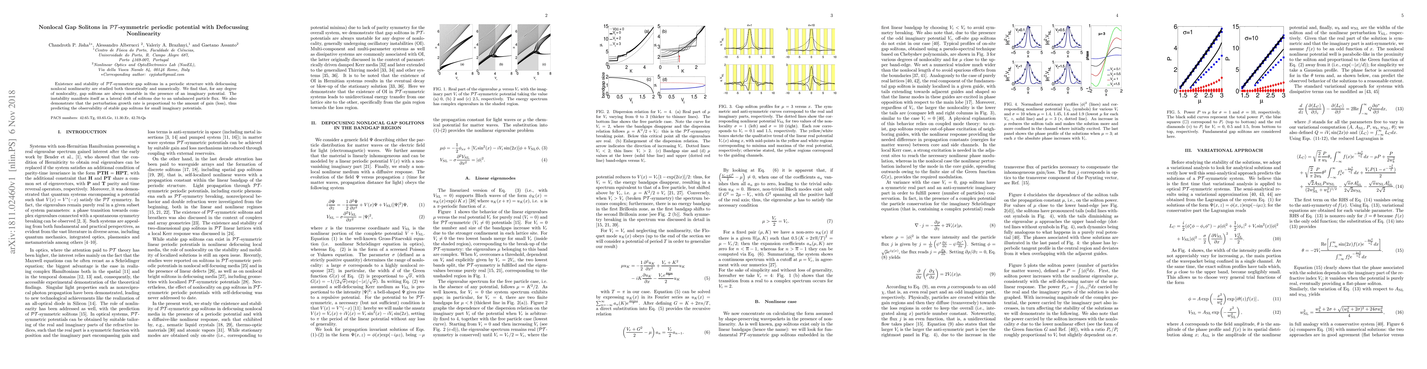 The paper investigates PT-symmetric gap solitons in periodic potentials with defocusing nonlocal nonlinearity, finding that solitons are unstable due to lateral drift from unbalanced particle flux, but suggest potential stability for small imaginary potentials based on the gain (loss) relationship.
