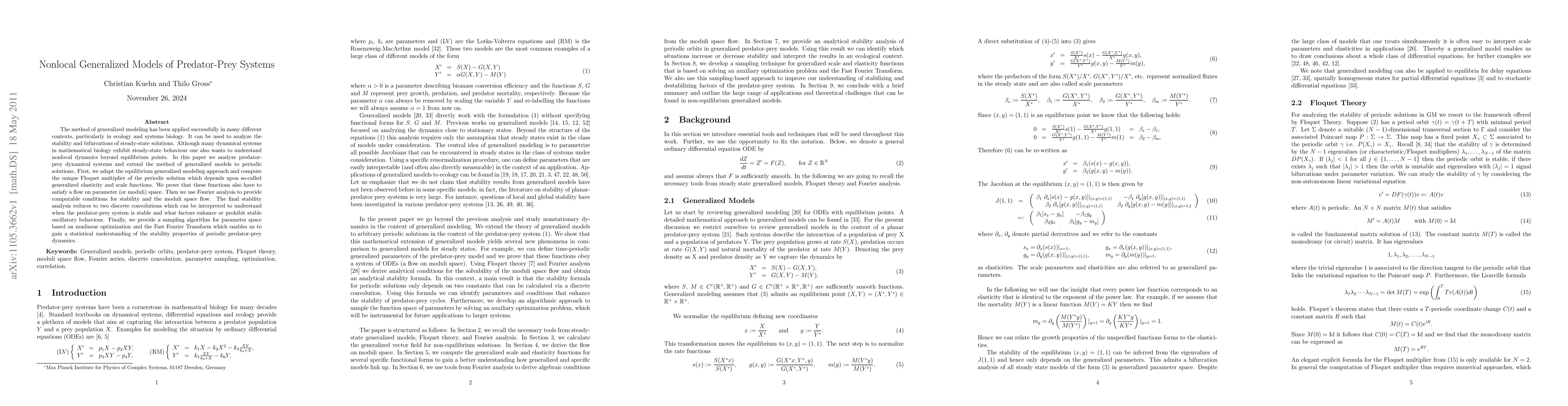 The method of generalized modeling has been applied successfully in many different contexts, particularly in ecology and systems biology. It can be used to analyze the stability and bifurcations of steady-state solutions. Although many dynamical systems in mathematical biology exhibit steady-state behaviour one also wants to understand nonlocal dynamics beyond equilibrium points. In this paper we analyze predator-prey dynamical systems and extend the method of generalized models to periodic solutions. First, we adapt the equilibrium generalized modeling approach and compute the unique Floquet multiplier of the periodic solution which depends upon so-called generalized elasticity and scale functions. We prove that these functions also have to satisfy a flow on parameter (or moduli) space. Then we use Fourier analysis to provide computable conditions for stability and the moduli space flow. The final stability analysis reduces to two discrete convolutions which can be interpreted to understand when the predator-prey system is stable and what factors enhance or prohibit stable oscillatory behaviour. Finally, we provide a sampling algorithm for parameter space based on nonlinear optimization and the Fast Fourier Transform which enables us to gain a statistical understanding of the stability properties of periodic predator-prey dynamics.