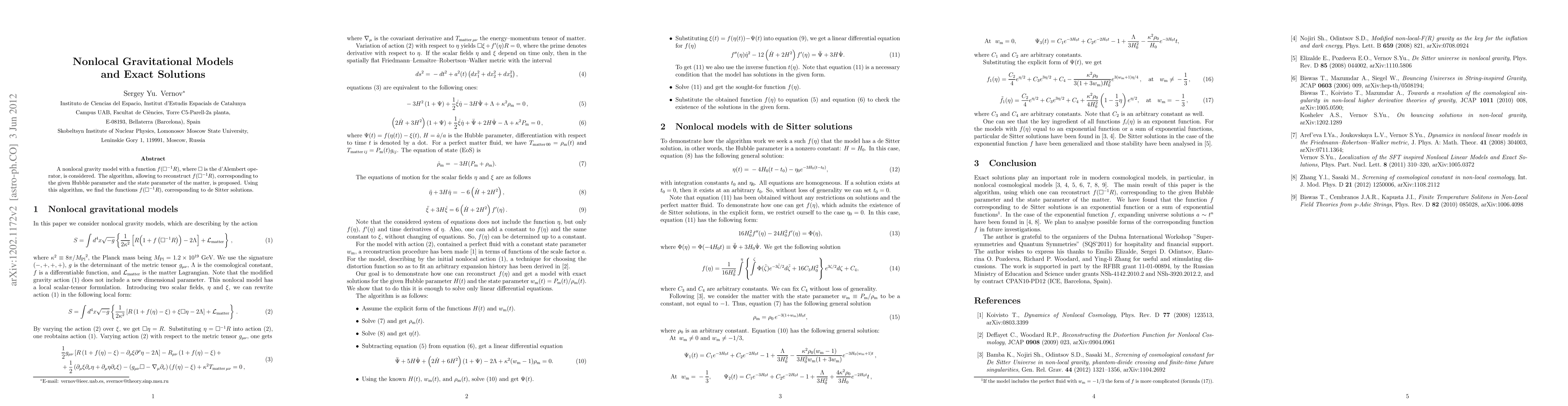 This paper presents a nonlocal gravity model with a function f(Box^-1 R), where Box is the d'Alembert operator. An algorithm is proposed to determine f(Box^-1 R) based on given Hubble parameter and matter state parameter, leading to de Sitter solutions.