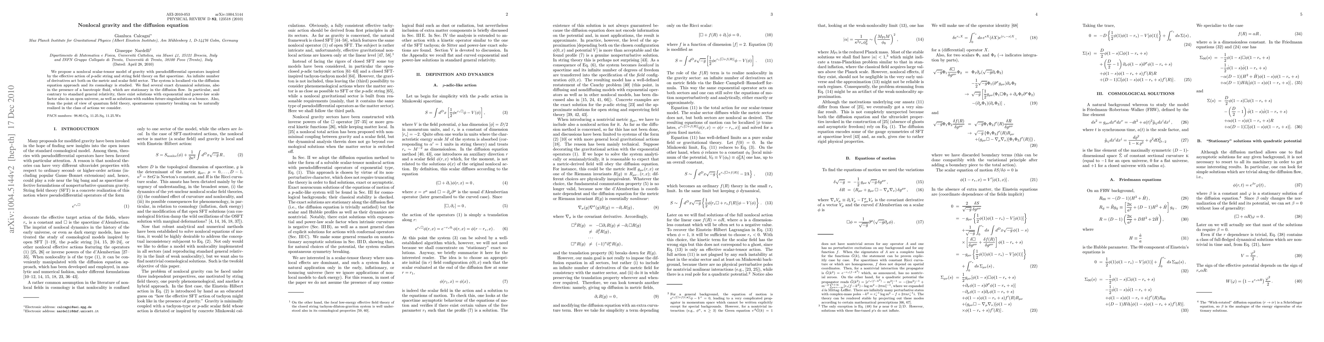 We propose a nonlocal scalar-tensor model of gravity with pseudodifferential operators inspired by the effective action of p-adic string and string field theory on flat spacetime. An infinite number of derivatives act both on the metric and scalar field sector. The system is localized via the diffusion equation approach and its cosmology is studied. We find several exact dynamical solutions, also in the presence of a barotropic fluid, which are stationary in the diffusion flow. In particular, and contrary to standard general relativity, there exist solutions with exponential and power-law scale factor also in an open universe, as well as solutions with sudden future singularities or a bounce. Also, from the point of view of quantum field theory, spontaneous symmetry breaking can be naturally realized in the class of actions we consider.
