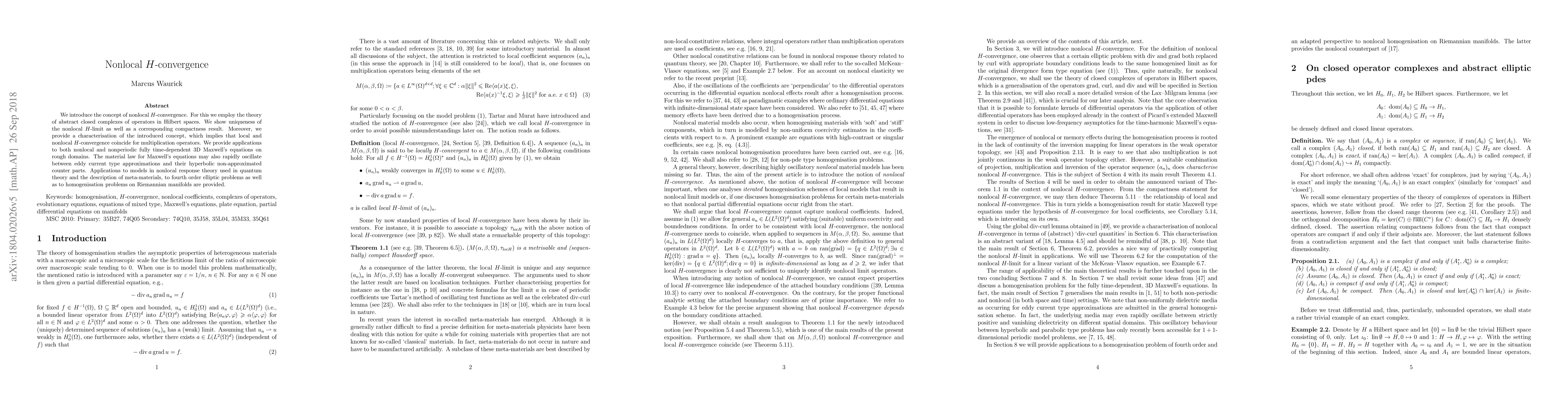 We introduce the concept of nonlocal $H$-convergence. For this we employ the theory of abstract closed complexes of operators in Hilbert spaces. We show uniqueness of the nonlocal $H$-limit as well as a corresponding compactness result. Moreover, we provide a characterisation of the introduced concept, which implies that local and nonlocal $H$-convergence coincide for multiplication operators. We provide applications to both nonlocal and nonperiodic fully time-dependent 3D Maxwell's equations on rough domains. The material law for Maxwell's equations may also rapidly oscillate between eddy current type approximations and their hyperbolic non-approximated counter parts. Applications to models in nonlocal response theory used in quantum theory and the description of meta-materials, to fourth order elliptic problems as well as to homogenisation problems on Riemannian manifolds are provided.
