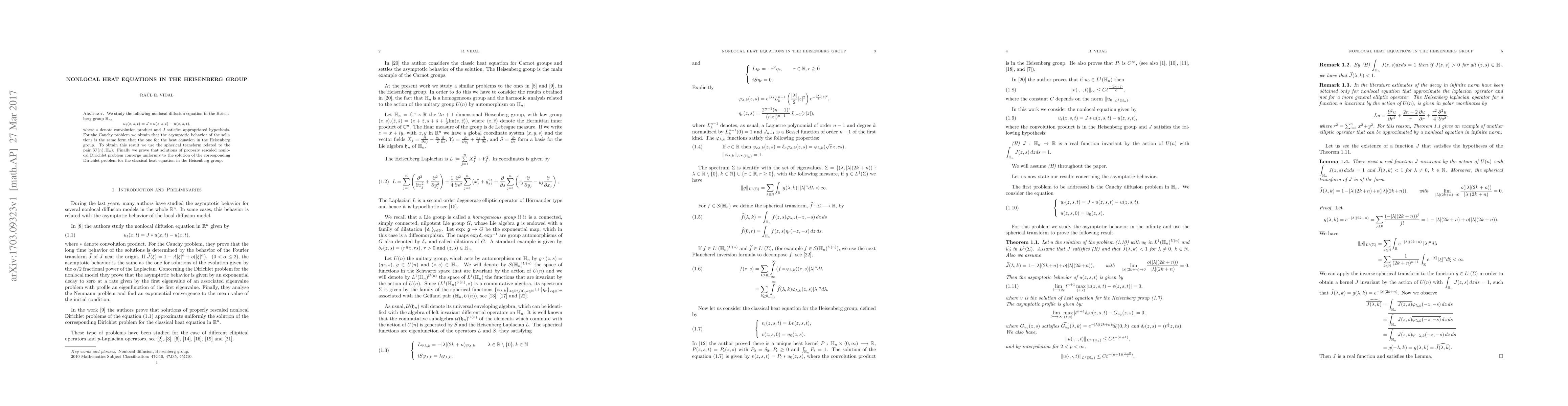 This paper investigates a nonlocal diffusion equation in the Heisenberg group, demonstrating that its solutions' asymptotic behavior mirrors that of the classical heat equation. The study employs the spherical transform and proves uniform convergence of rescaled solutions to the classical heat equation's solution.