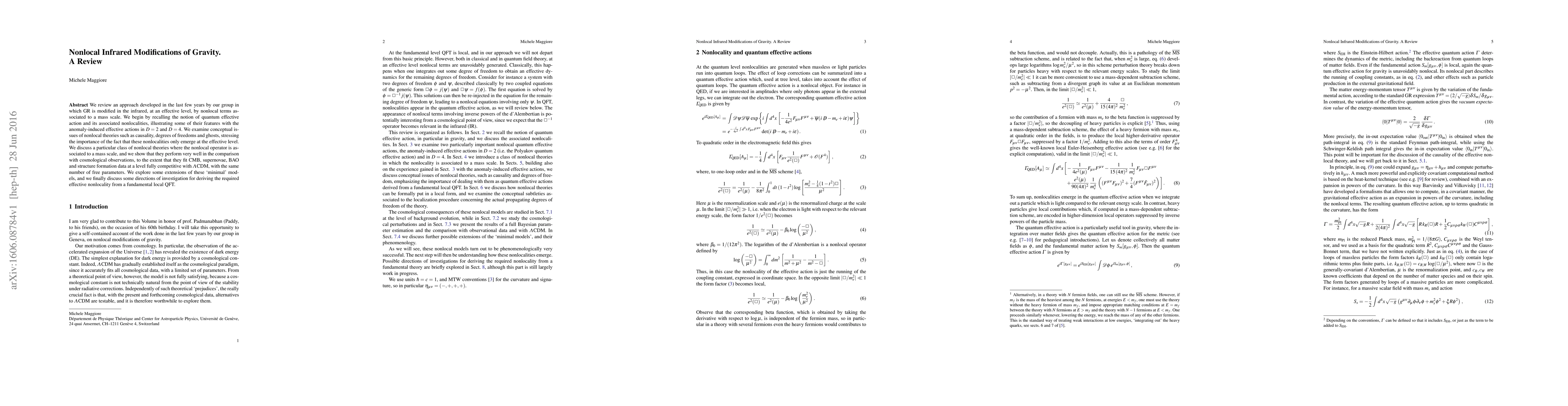 We review an approach developed in the last few years by our group in which GR is modified in the infrared, at an effective level, by nonlocal terms associated to a mass scale. We begin by recalling the notion of quantum effective action and its associated nonlocalities, illustrating some of their features with the anomaly-induced effective actions in $D=2$ and $D=4$. We examine conceptual issues of nonlocal theories such as causality, degrees of freedoms and ghosts, stressing the importance of the fact that these nonlocalities only emerge at the effective level. We discuss a particular class of nonlocal theories where the nonlocal operator is associated to a mass scale, and we show that they perform very well in the comparison with cosmological observations, to the extent that they fit CMB, supernovae, BAO and structure formation data at a level fully competitive with $\Lambda$CDM, with the same number of free parameters. We explore some extensions of these `minimal' models, and we finally discuss some directions of investigation for deriving the required effective nonlocality from a fundamental local QFT.