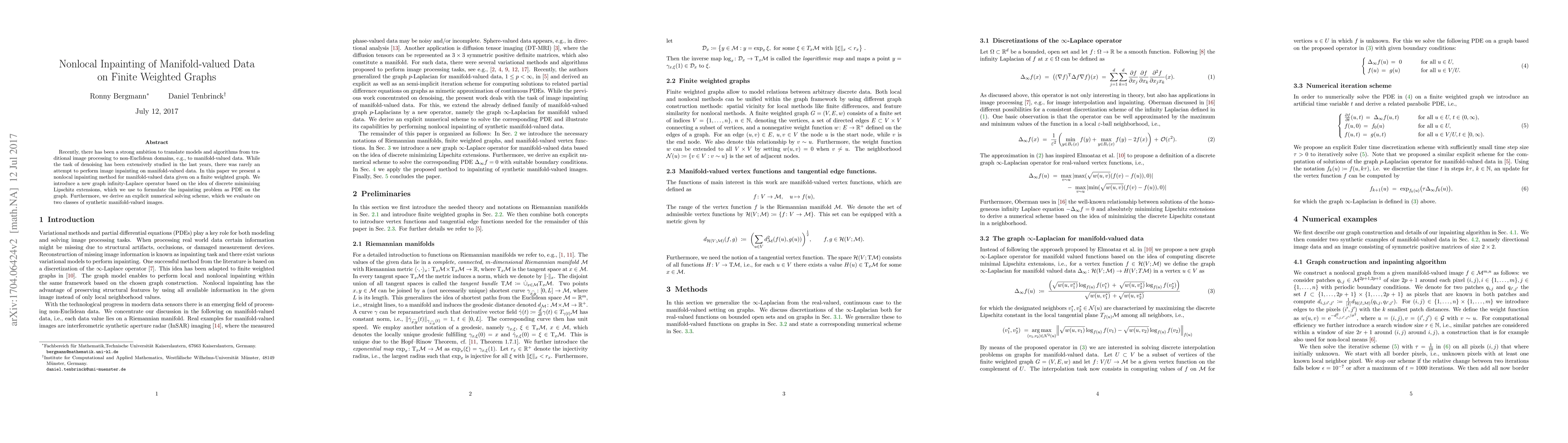This paper introduces a novel nonlocal inpainting method for manifold-valued data represented on finite weighted graphs, utilizing a new graph infinity-Laplace operator for formulating the inpainting problem as a PDE on the graph, and evaluates it with synthetic data.