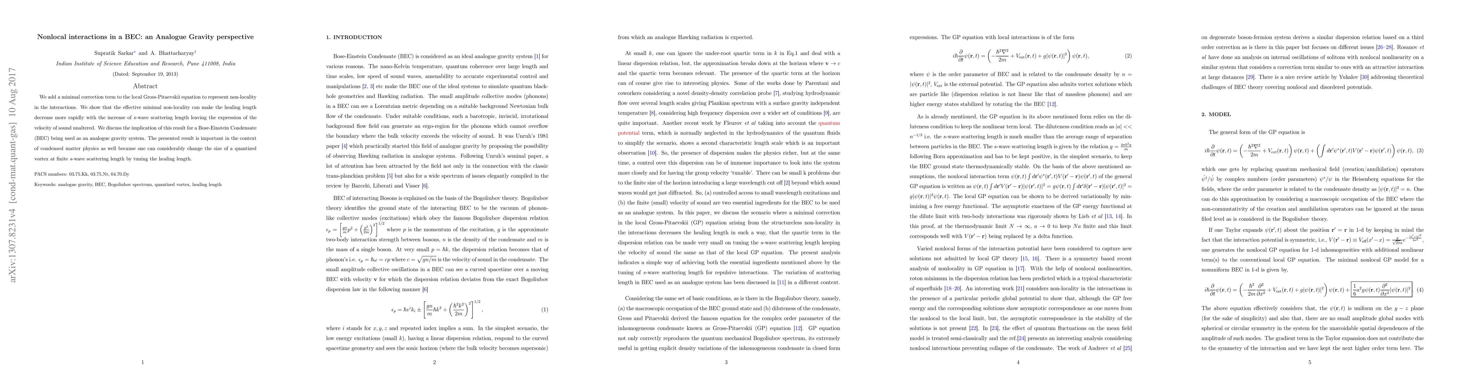 This research introduces a minimal correction to the Gross-Pitaevskii equation to model non-local interactions in BECs. It demonstrates that this adjustment reduces the healing length more swiftly with increasing s-wave scattering length, without affecting the sound velocity. The findings are significant for BEC-based analogue gravity systems and condensed matter physics, as they show potential to alter quantized vortex sizes by adjusting healing length.