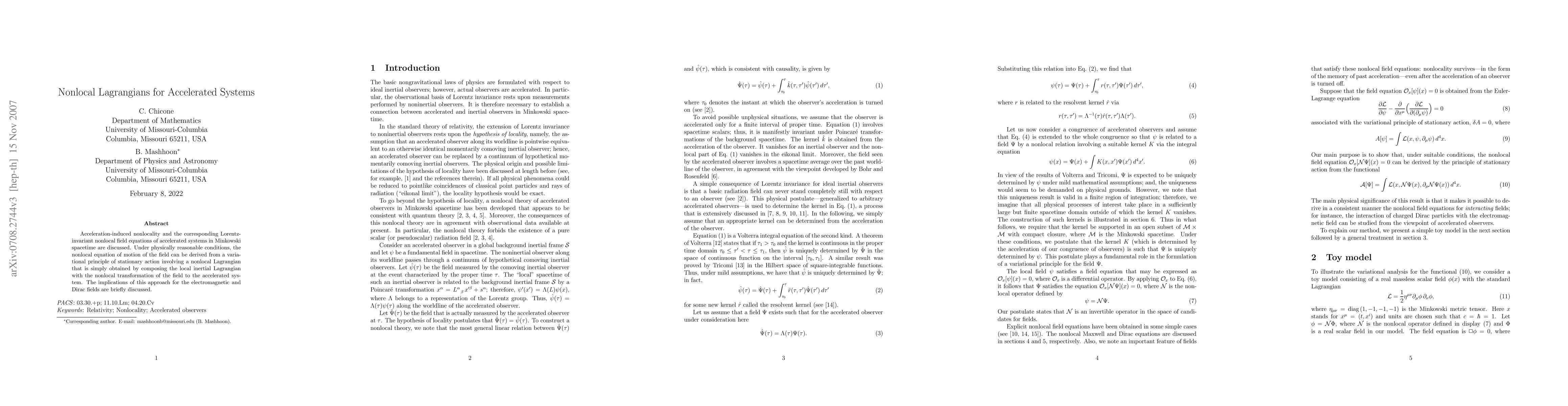This paper explores nonlocal Lagrangians for accelerated systems, deriving nonlocal field equations from a variational principle that incorporates acceleration-induced nonlocality. The approach combines the local inertial Lagrangian with a nonlocal transformation, with implications for electromagnetic and Dirac fields discussed.