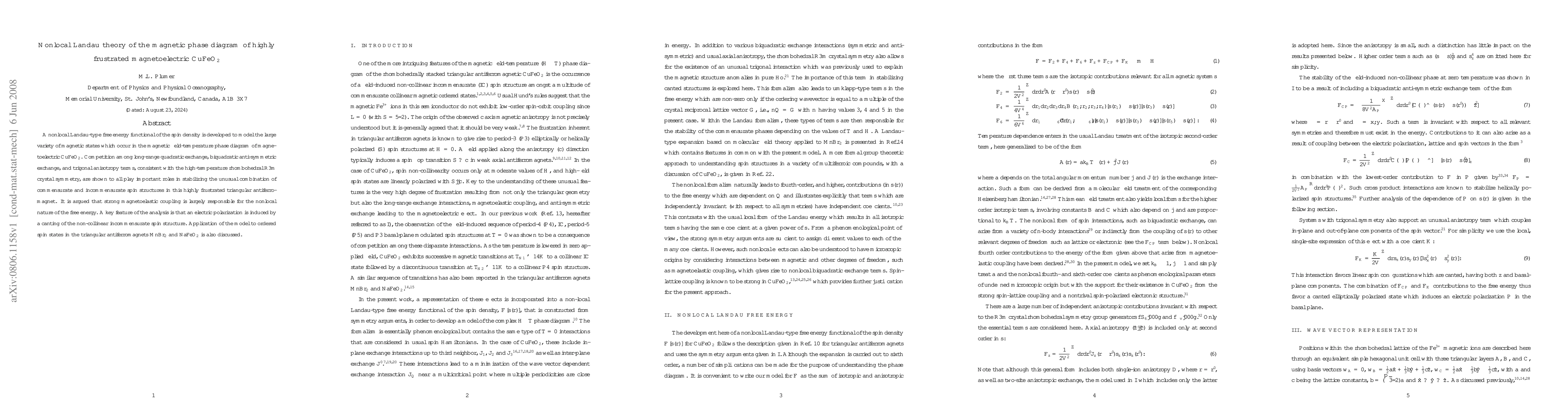 This paper develops a nonlocal Landau theory to model the complex magnetic phase diagram of CuFeO$_2$, highlighting the interplay of various exchange and anisotropy terms that stabilize its unique spin structures. The study emphasizes the role of magnetoelastic coupling and the induction of electric polarization by spin canting.