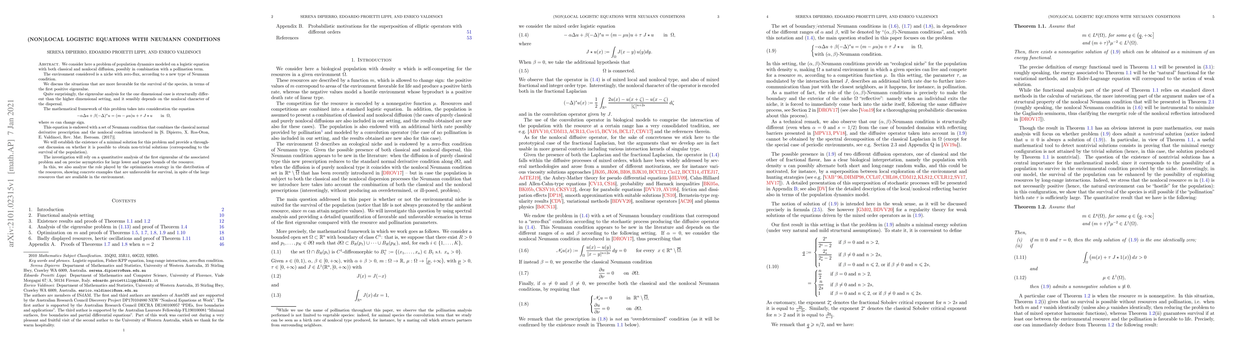 We consider here a problem of population dynamics modeled on a logistic equation with both classical and nonlocal diffusion, possibly in combination with a pollination term. The environment considered is a niche with zero-flux, according to a new type of Neumann condition. We discuss the situations that are more favorable for the survival of the species, in terms of the first positive eigenvalue. Quite surprisingly, the eigenvalue analysis for the one dimensional case is structurally different than the higher dimensional setting, and it sensibly depends on the nonlocal character of the dispersal. The mathematical framework of this problem takes into consideration the equation $$ -\alpha\Delta u +\beta(-\Delta)^su =(m-\mu u)u+\tau\;J\star u \qquad{\mbox{in }}\; \Omega,$$ where $m$ can change sign. This equation is endowed with a set of Neumann condition that combines the classical normal derivative prescription and the nonlocal condition introduced in [S. Dipierro, X. Ros-Oton, E. Valdinoci, Rev. Mat. Iberoam. (2017)]. We will establish the existence of a minimal solution for this problem and provide a throughout discussion on whether it is possible to obtain non-trivial solutions (corresponding to the survival of the population). The investigation will rely on a quantitative analysis of the first eigenvalue of the associated problem and on precise asymptotics for large lower and upper bounds of the resource. In this, we also analyze the role played by the optimization strategy in the distribution of the resources, showing concrete examples that are unfavorable for survival, in spite of the large resources that are available in the environment.