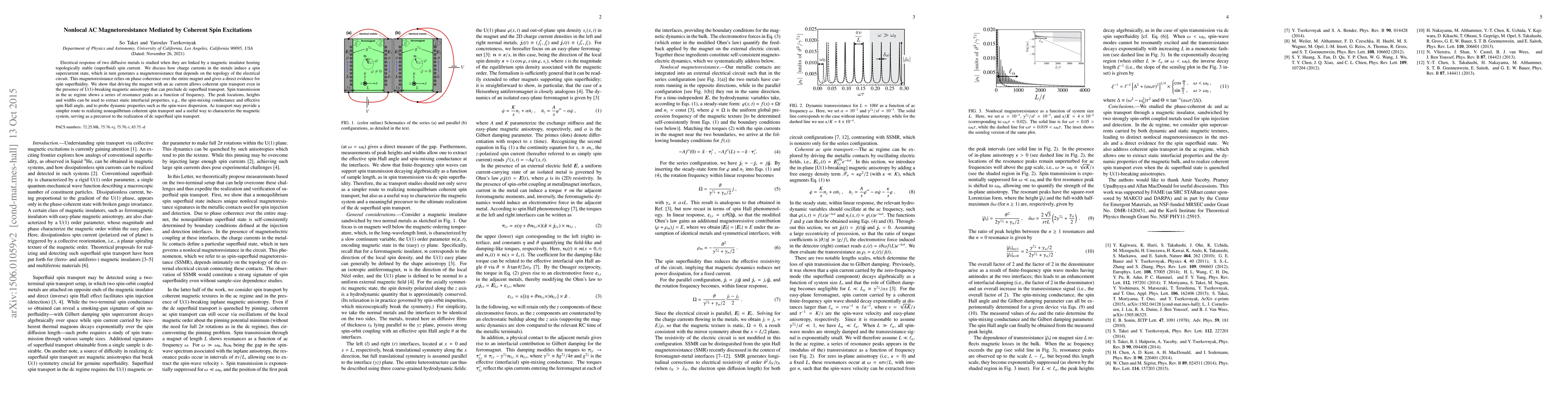 The electrical response of two diffusive metals is studied when they are linked by a magnetic insulator hosting a topologically stable (superfluid) spin current. We discuss how charge currents in the metals induce a spin supercurrent state, which in turn generates a magnetoresistance that depends on the topology of the electrical circuit. This magnetoresistance relies on phase coherence over the entire magnet and gives direct evidence for spin superfluidity. We show that driving the magnet with an ac current allows coherent spin transport even in the presence of U(1)-breaking magnetic anisotropy that can preclude dc superfluid transport. Spin transmission in the ac regime shows a series of resonance peaks as a function of frequency. The peak locations, heights, and widths can be used to extract static interfacial properties, e.g., the spin-mixing conductance and effective spin Hall angle, and to probe dynamic properties such as the spin-wave dispersion. Thus, ac transport may provide a simpler route to realizing nonequilbrium coherent spin transport and a useful way to characterize the magnetic system, serving as a precursor to the realization of dc superfluid spin transport.