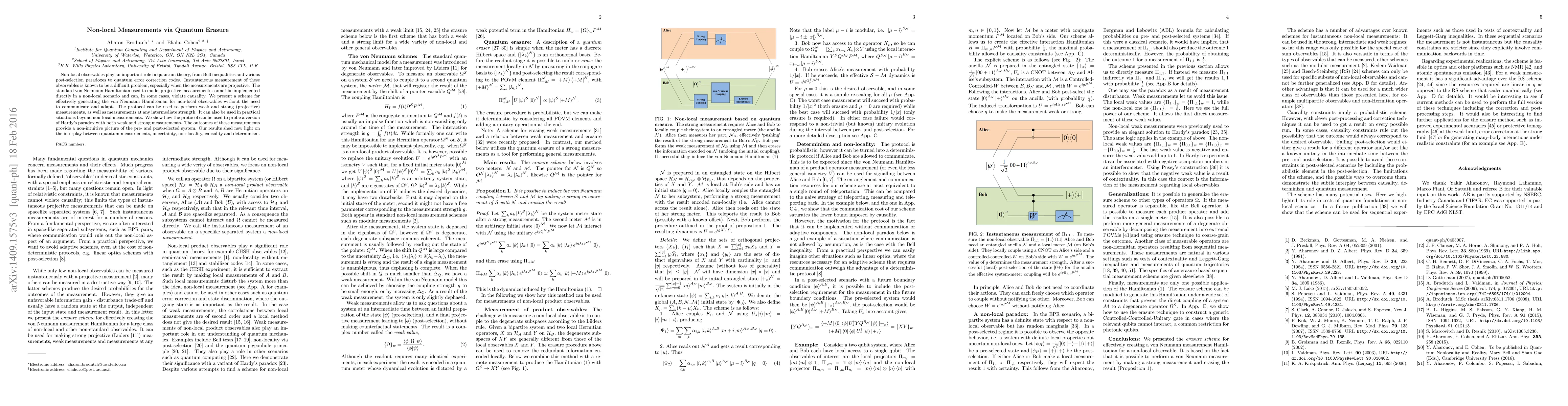 Non-local observables play an important role in quantum theory, from Bell inequalities and various post-selection paradoxes to quantum error correction codes. Instantaneous measurement of these observables is known to be a difficult problem, especially when the measurements are projective. The standard von Neumann Hamiltonian used to model projective measurements cannot be implemented directly in a non-local scenario and can, in some cases, violate causality. We present a scheme for effectively generating the von Neumann Hamiltonian for non-local observables without the need to communicate and adapt. The protocol can be used to perform weak and strong (projective) measurements, as well as measurements at any intermediate strength. It can also be used in practical situations beyond non-local measurements. We show how the protocol can be used to probe a version of Hardy's paradox with both weak and strong measurements. The outcomes of these measurements provide a non-intuitive picture of the pre- and post-selected system. Our results shed new light on the interplay between quantum measurements, uncertainty, non-locality, causality and determinism.