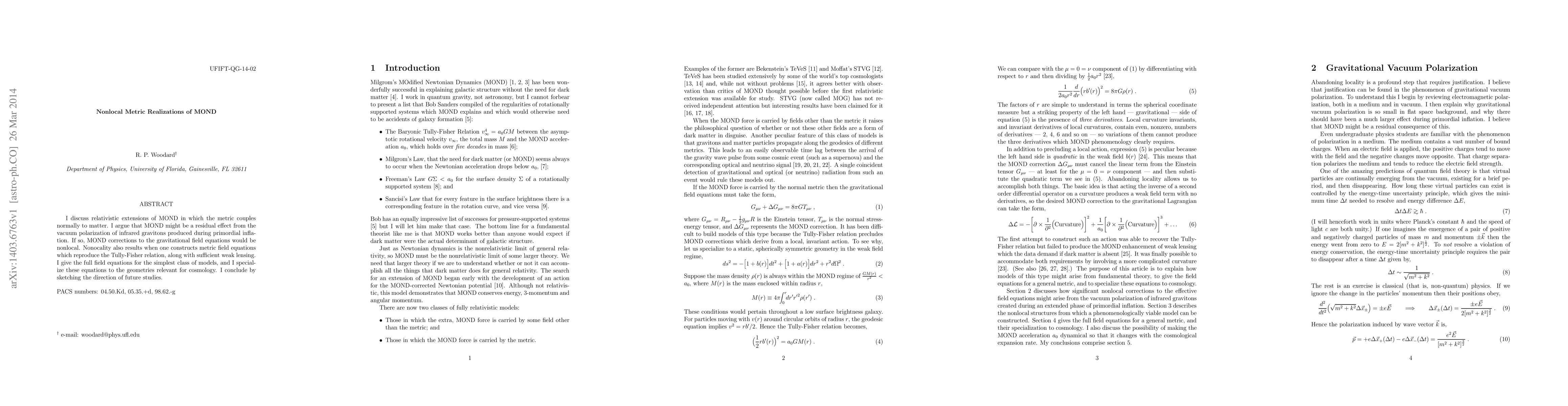 I discuss relativistic extensions of MOND in which the metric couples normally to matter. I argue that MOND might be a residual effect from the vacuum polarization of infrared gravitons produced during primordial inflation. If so, MOND corrections to the gravitational field equations would be nonlocal. Nonocality also results when one constructs metric field equations which reproduce the Tully-Fisher relation, along with sufficient weak lensing. I give the full field equations for the simplest class of models, and I specialize these equations to the geometries relevant for cosmology. I conclude by sketching the direction of future studies.