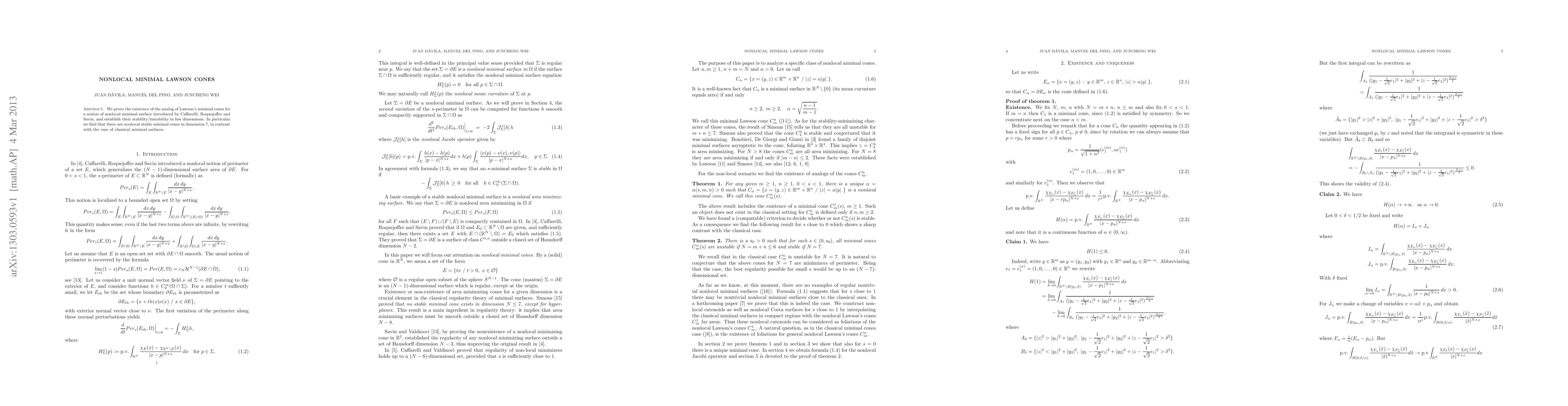 Summary: The paper proves the existence of nonlocal minimal cones analogous to Lawson's minimal cones, and finds stable nonlocal minimal cones in dimension 7, contrasting with the instability of classical minimal surfaces in low dimensions.