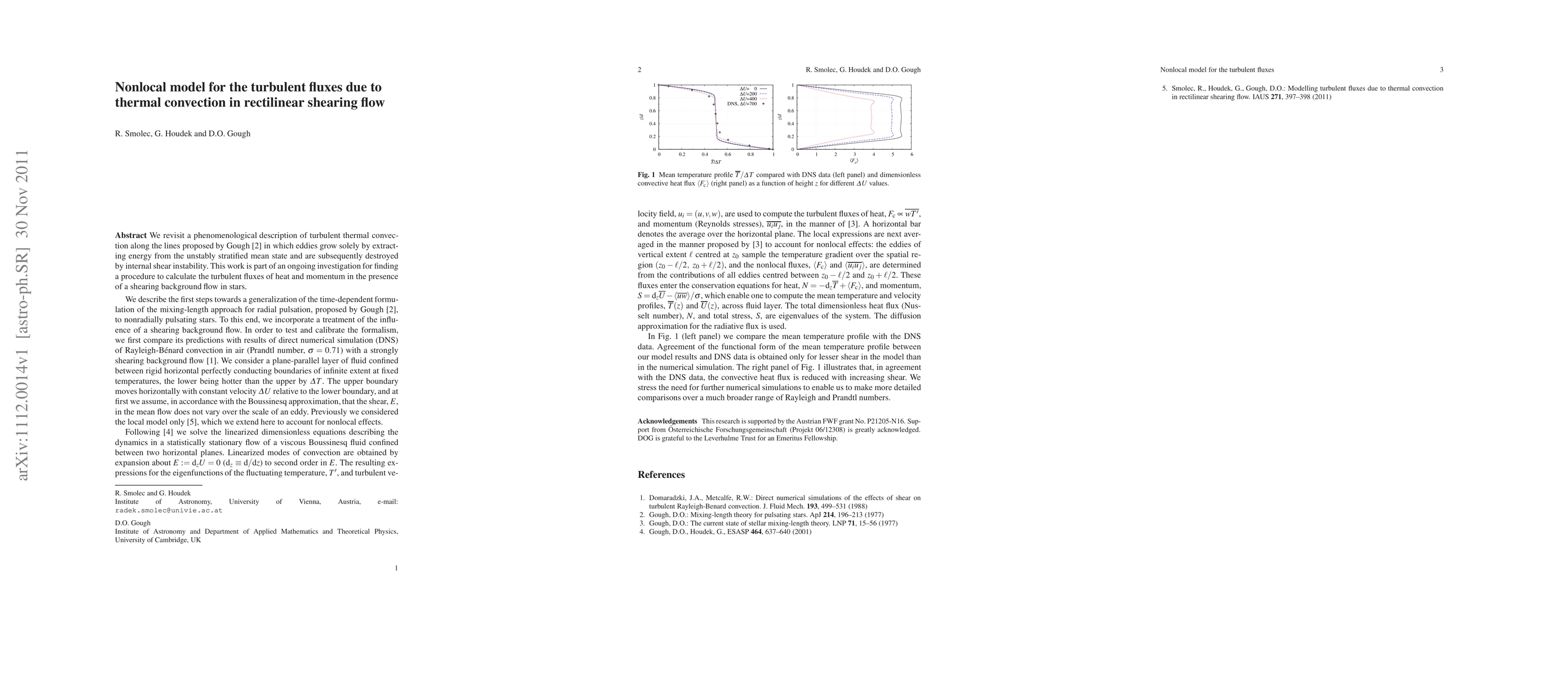 The paper presents a nonlocal model for turbulent fluxes due to thermal convection in rectilinear shearing flows, extending the local mixing-length approach to non-radially pulsating stars.