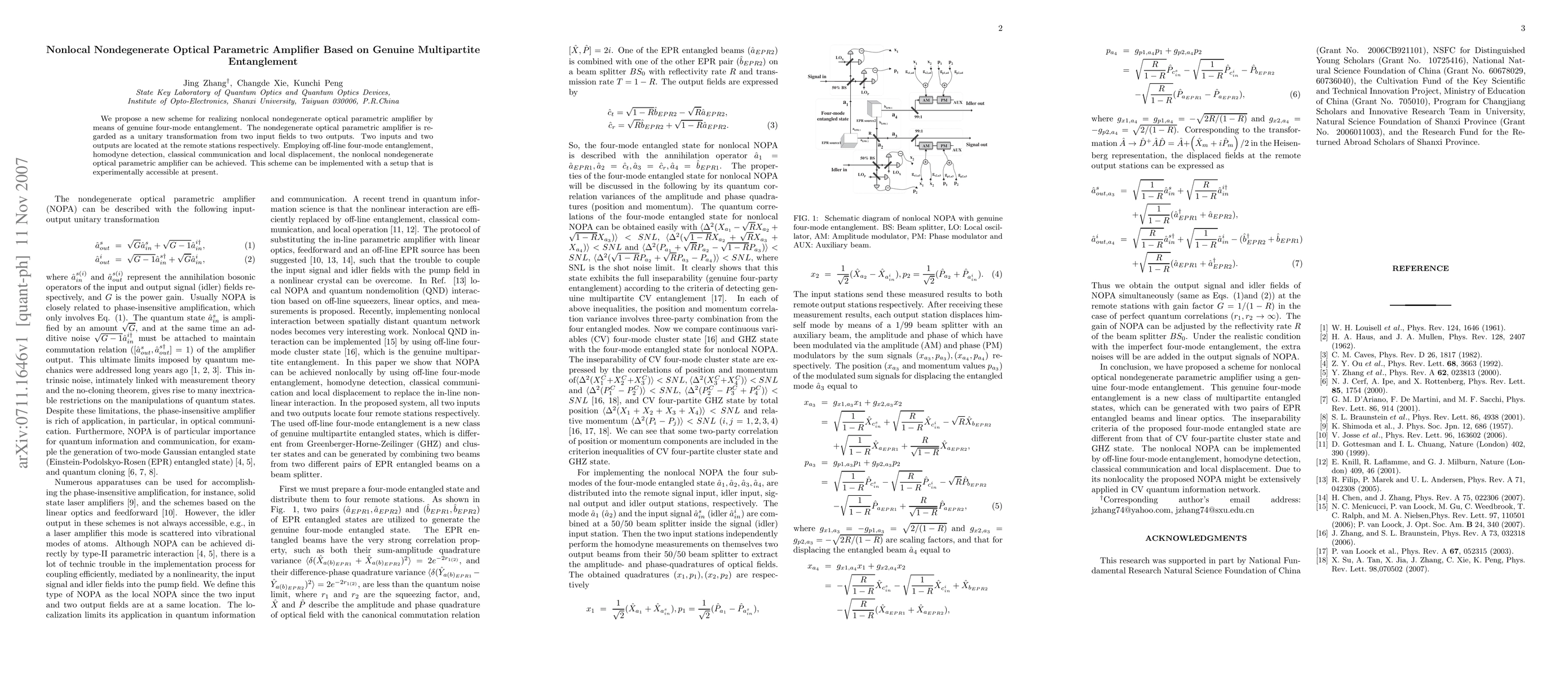 The proposed scheme demonstrates a novel approach to nonlocal optical parametric amplification using genuine four-mode entanglement.