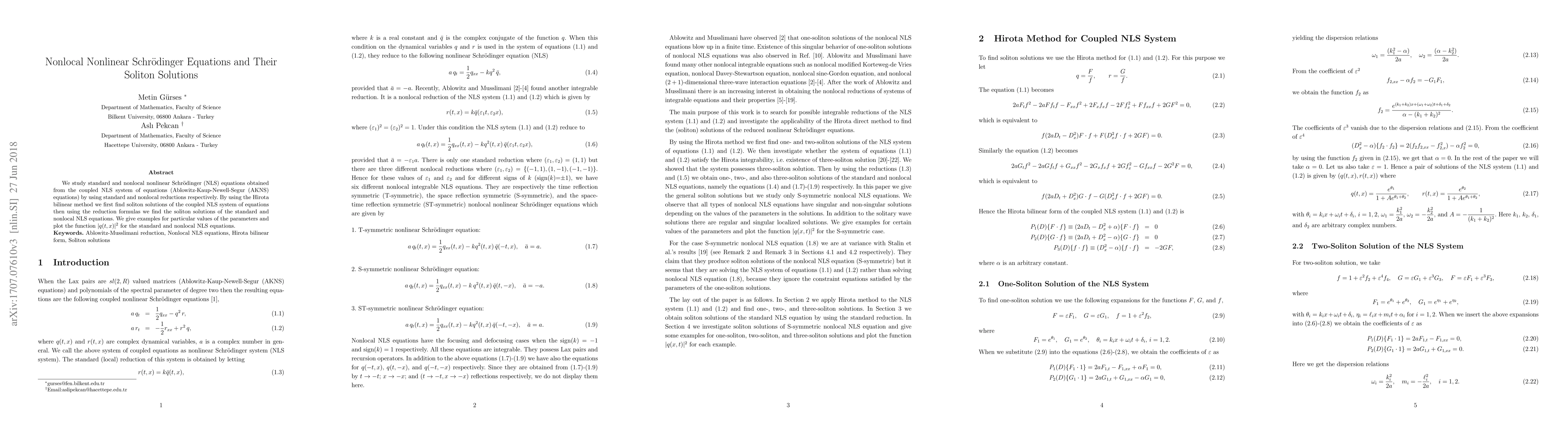 We study standard and nonlocal nonlinear Schr\"{o}dinger (NLS) equations obtained from the coupled NLS system of equations (Ablowitz-Kaup-Newell-Segur (AKNS) equations) by using standard and nonlocal reductions respectively. By using the Hirota bilinear method we first find soliton solutions of the coupled NLS system of equations then using the reduction formulas we find the soliton solutions of the standard and nonlocal NLS equations. We give examples for particular values of the parameters and plot the function $|q(t,x)|^2$ for the standard and nonlocal NLS equations.