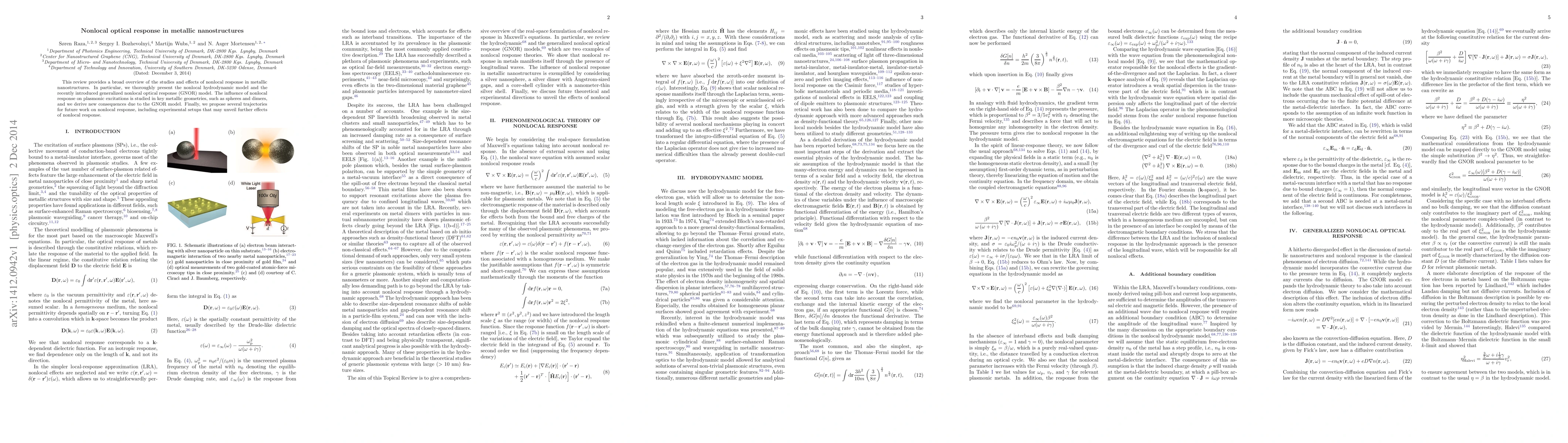 This review provides a broad overview of the studies and effects of nonlocal response in metallic nanostructures. In particular, we thoroughly present the nonlocal hydrodynamic model and the recently introduced generalized nonlocal optical response (GNOR) model. The influence of nonlocal response on plasmonic excitations is studied in key metallic geometries, such as spheres and dimers, and we derive new consequences due to the GNOR model. Finally, we propose several trajectories for future work on nonlocal response, including experimental setups that may unveil further effects of nonlocal response.