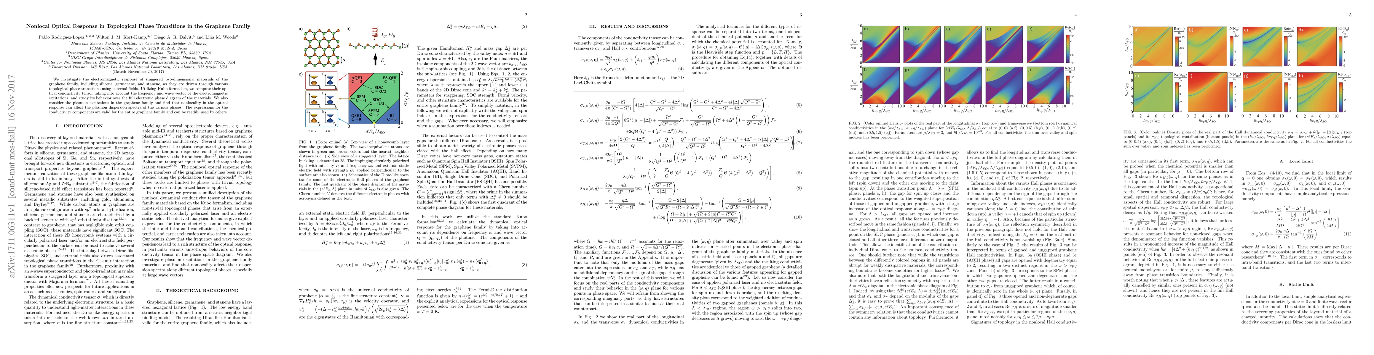 This paper examines the electromagnetic response of graphene-family materials (silicene, germanene, stanene) during topological phase transitions, revealing how nonlocal optical effects influence plasmon dispersion spectra. The study employs Kubo formalism to compute optical conductivity tensors, providing expressions applicable across the entire graphene family.
