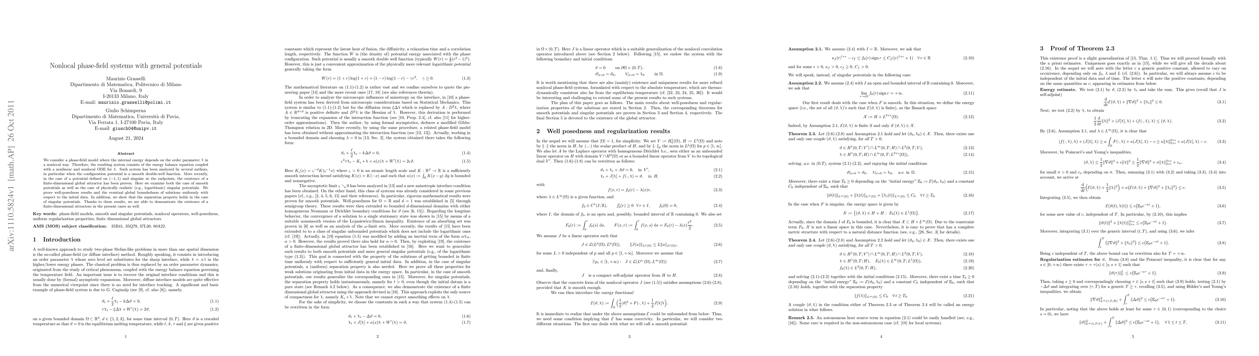 We consider a phase-field model where the internal energy depends on the order parameter in a nonlocal way. Therefore, the resulting system consists of the energy balance equation coupled with a nonlinear and nonlocal ODE for the order parameter. Such system has been analyzed by several authors, in particular when the configuration potential is a smooth double-well function. More recently, in the case of a potential defined on (-1,1) and singular at the endpoints, the existence of a finite-dimensional global attractor has been proven. Here we examine both the case of smooth potentials as well as the case of physically realistic (e.g., logarithmic) singular potentials. We prove well-posedness results and the eventual global boundedness of solutions uniformly with respect to the initial data. In addition, we show that the separation property holds in the case of singular potentials. Thanks to these results, we are able to demonstrate the existence of a finite-dimensional attractors in the present cases as well.