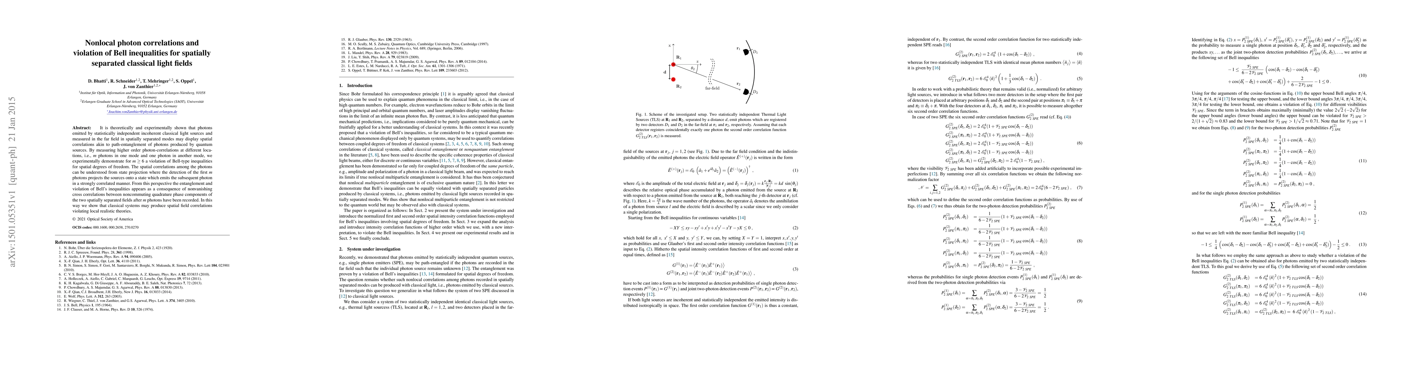 It is theoretically and experimentally shown that photons emitted by statistically independent incoherent classical light sources and measured in the far field in spatially separated modes may display spatial correlations akin to path-entanglement of photons produced by quantum sources. By measuring higher order photon-correlations at different locations, i.e., $m$ photons in one mode and one photon in another mode, we experimentally demonstrate for $m \geq 6$ a violation of Bell-type inequalities for spatial degrees of freedom. The spatial correlations among the photons can be understood from state projection where the detection of the first $m$ photons projects the sources onto a state which emits the subsequent photon in a strongly correlated manner. From this perspective the entanglement and violation of Bell's inequalities appears as a consequence of nonvanishing cross correlations between noncommuting quadrature phase components of the two spatially separated fields after $m$ photons have been recorded. In this way we show that classical systems may produce spatial field correlations violating local realistic theories.