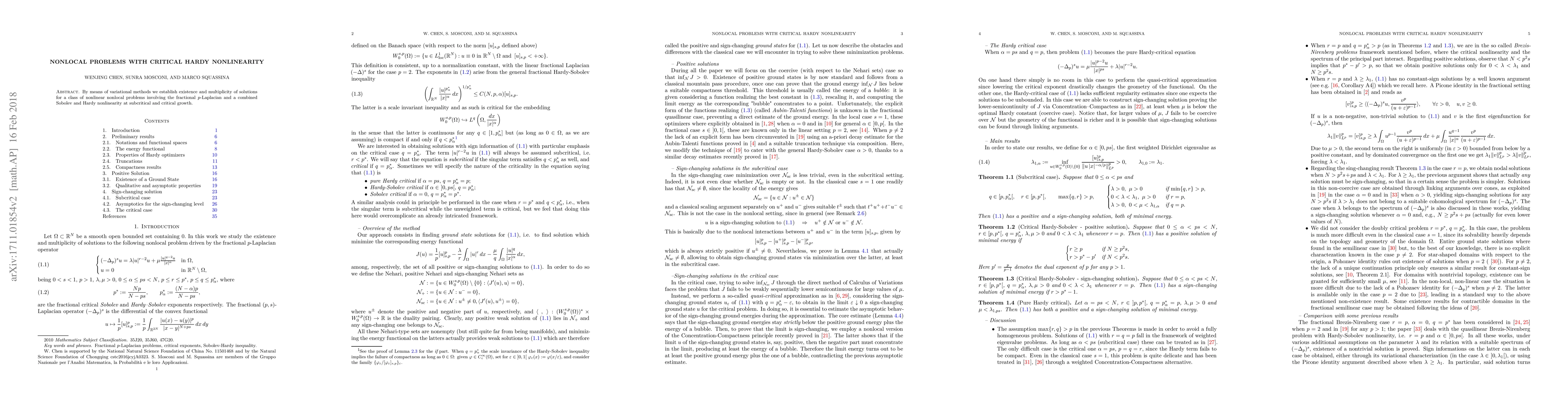 Summary: This paper utilizes variational techniques to demonstrate the existence and multiplicity of solutions for a class of nonlinear nonlocal problems featuring the fractional p-Laplacian and critical Hardy nonlinearity, addressing both subcritical and critical growth scenarios.