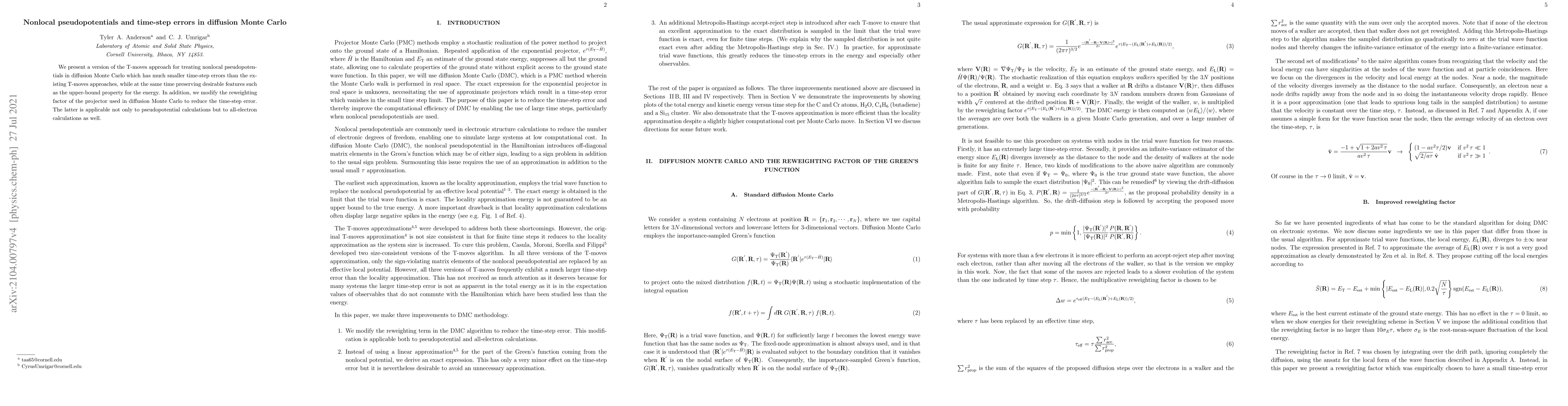 This paper introduces an improved T-moves method for nonlocal pseudopotentials in diffusion Monte Carlo, achieving significantly lower time-step errors while maintaining the energy upper-bound property. Additionally, a modified reweighting factor reduces time-step errors, benefiting both pseudopotential and all-electron calculations.