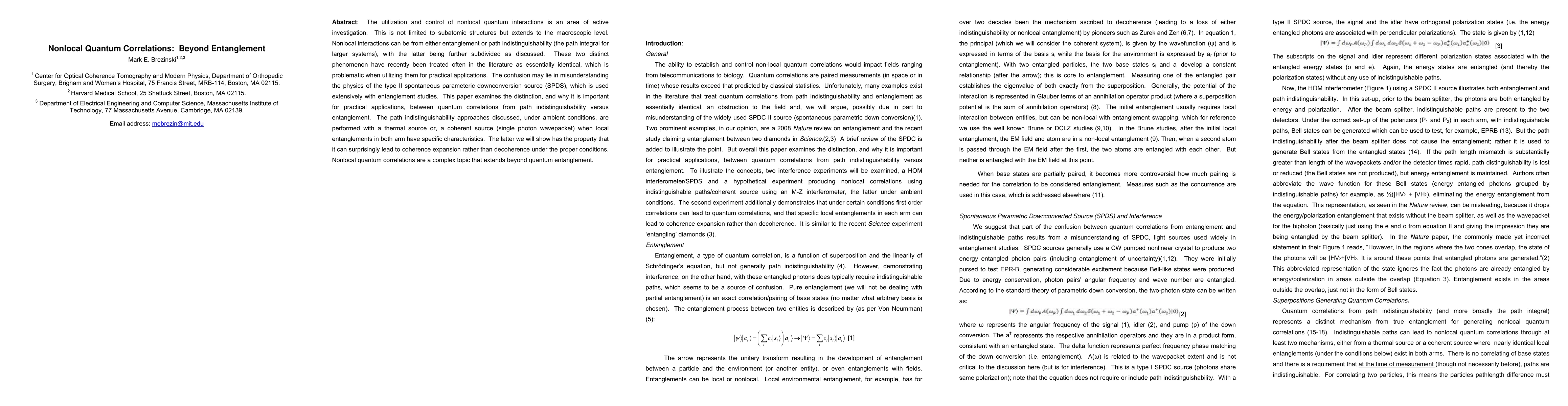 The utilization and control of nonlocal quantum interactions is an area of active investigation. This is not limited to subatomic structures but extends to the macroscopic level. Nonlocal interactions can be from either entanglement or path indistinguishability (the path integral for larger systems), with the latter being further subdivided as discussed. These two distinct phenomenon have recently been treated often in the literature as essentially identical, which is problematic when utilizing them for practical applications. The confusion may lie in misunderstanding the physics of the type II spontaneous parameteric downconversion source (SPDS), which is used extensively with entanglement studies. This paper examines the distinction, and why it is important for practical applications, between quantum correlations from path indistinguishability versus entanglement. The path indistinguishability approaches discussed, under ambient conditions, are performed with a thermal source or, a coherent source (single photon wavepacket) when local entanglements in both arm have specific characteristics. The latter we will show has the property that it can surprisingly lead to coherence expansion rather than decoherence under the proper conditions. Nonlocal quantum correlations are a complex topic that extends beyond quantum entanglement.