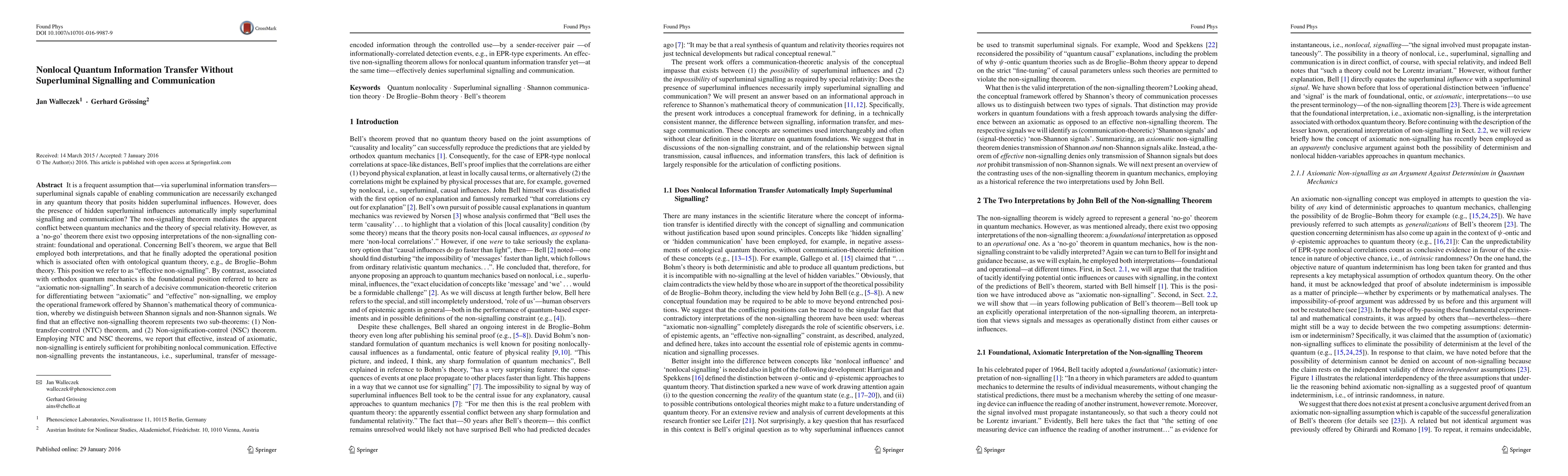 It is a frequent assumption that - via superluminal information transfers - superluminal signals capable of enabling communication are necessarily exchanged in any quantum theory that posits hidden superluminal influences. However, does the presence of hidden superluminal influences automatically imply superluminal signalling and communication? The non-signalling theorem mediates the apparent conflict between quantum mechanics and the theory of special relativity. However, as a 'no-go' theorem there exist two opposing interpretations of the non-signalling constraint: foundational and operational. Concerning Bell's theorem, we argue that Bell employed both interpretations at different times. Bell finally pursued an explicitly operational position on non-signalling which is often associated with ontological quantum theory, e.g., de Broglie-Bohm theory. This position we refer to as "effective non-signalling". By contrast, associated with orthodox quantum mechanics is the foundational position referred to here as "axiomatic non-signalling". In search of a decisive communication-theoretic criterion for differentiating between "axiomatic" and "effective" non-signalling, we employ the operational framework offered by Shannon's mathematical theory of communication. We find that an effective non-signalling theorem represents two sub-theorems, which we call (1) non-transfer-control (NTC) theorem, and (2) non-signification-control (NSC) theorem. Employing NTC and NSC theorems, we report that effective, instead of axiomatic, non-signalling is entirely sufficient for prohibiting nonlocal communication. An effective non-signalling theorem allows for nonlocal quantum information transfer yet - at the same time - effectively denies superluminal signalling and communication.