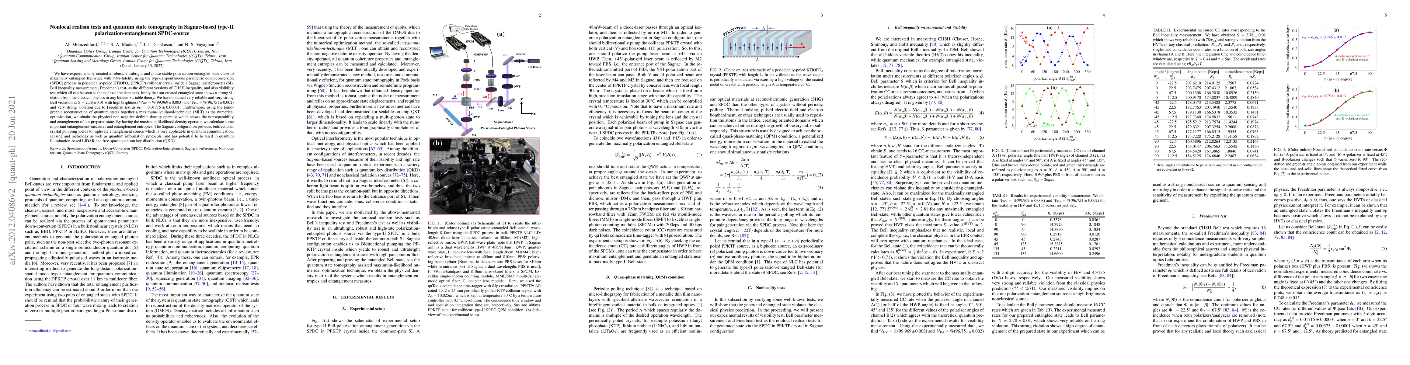 We have experimentally created a robust, ultrabright and phase-stable polarization-entangled state close to maximally entangled Bell-state with $ \% 98 $-fidelity using the type-II spontaneous parametric down-conversion (SPDC) process in periodically-poled KTiOPO$ _4 $ (PPKTP) collinear crystal inside a Sagnac interferometer (SI). Bell inequality measurement, Freedman's test, as the different versions of CHSH inequality, and also visibility test which all can be seen as the nonlocal realism tests, imply that our created entangled state shows a strong violation from the classical physics or any hidden-variable theory. We have obtained very reliable and very strong Bell violation as $ S=2.78 \pm 0.01 $ with high brightness $ \mathcal{V}_{\rm HV}= \% (99.969 \pm 0.003) $ and $\mathcal{V}_{\rm DA}= \% (96.751 \pm 0.002) $ and very strong violation due to Freedman test as $ \delta_{\rm F} = 0.01715 \pm 0.00001 $. Furthermore, using the tomographic reconstruction of quantum states together a maximum-likelihood-technique (MLT) as the numerical optimization, we obtain the physical non-negative definite density operator which shows the nonseparability and entanglement of our prepared state. By having the maximum likelihood density operator, we calculate some important entanglement-measures and entanglement entropies. The Sagnac configuration provides bidirectional crystal pumping yields to high-rate entanglement source which is very applicable in quantum communication, sensing and metrology as well as quantum information protocols, and has potential to be used in quantum illumination-based LIDAR and free-space quantum key distribution (QKD).